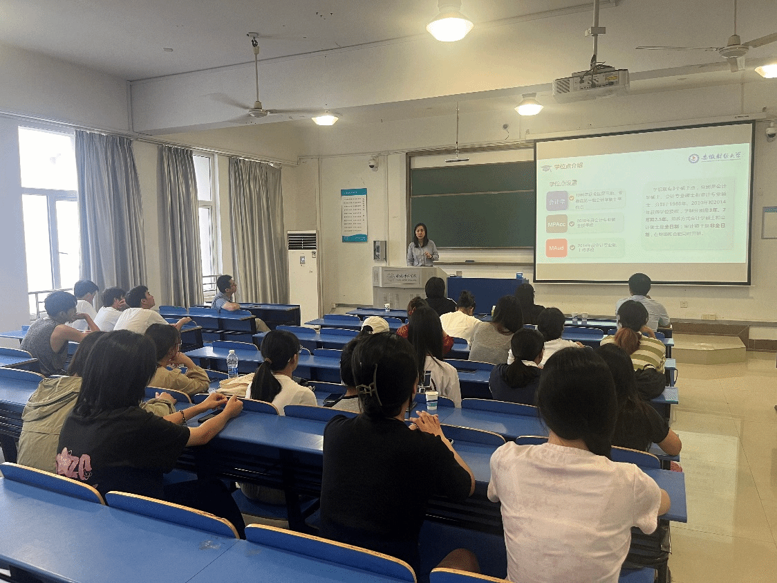 为提升学生更好地了解研究生招生学校和专业情况,助力经管学院学子报考研究生,9月18日下午,经济与管理学院在逸夫楼A204成功举办研究生招生宣讲会。本次宣讲会特邀安徽财经大学会计学院副院长董小红、会计学硕中心副主任郭凤华、会计专硕中心副主任李坤榕以及审计专硕中心副主任廖成赟亲临现场,为考研学子答疑解惑。经管学院副院长钟玉文和学院相关专业优秀学子参会。