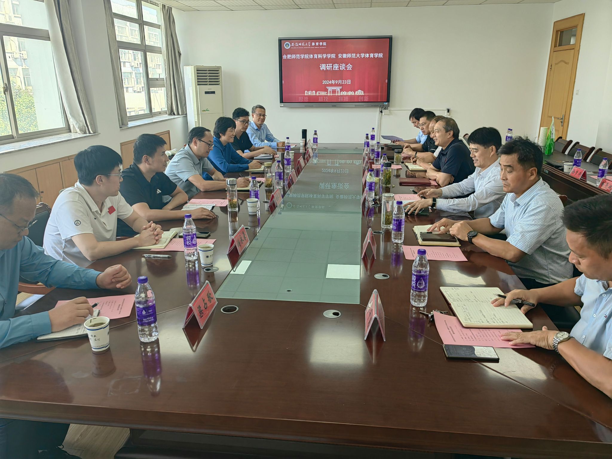 9月23日,调研组一行来到安徽师范大学体育学院,安徽师范大学体育学院全体领导班子成员参加座谈会,党委书记黄德春主持座谈会并对调研组一行表示欢迎,院长金涛介绍了体育学院基本情况,希望双方围绕党建与人才培养,在提高人才培养质量、加大科技成果转化、主动融入长三角区域经济一体化发展战略等方面进一步加强合作。双方还围绕人才培养、学科振兴计划与科学研究、足球学院建设、场馆管理、大学生体测工作等进行了深入交流和讨论。