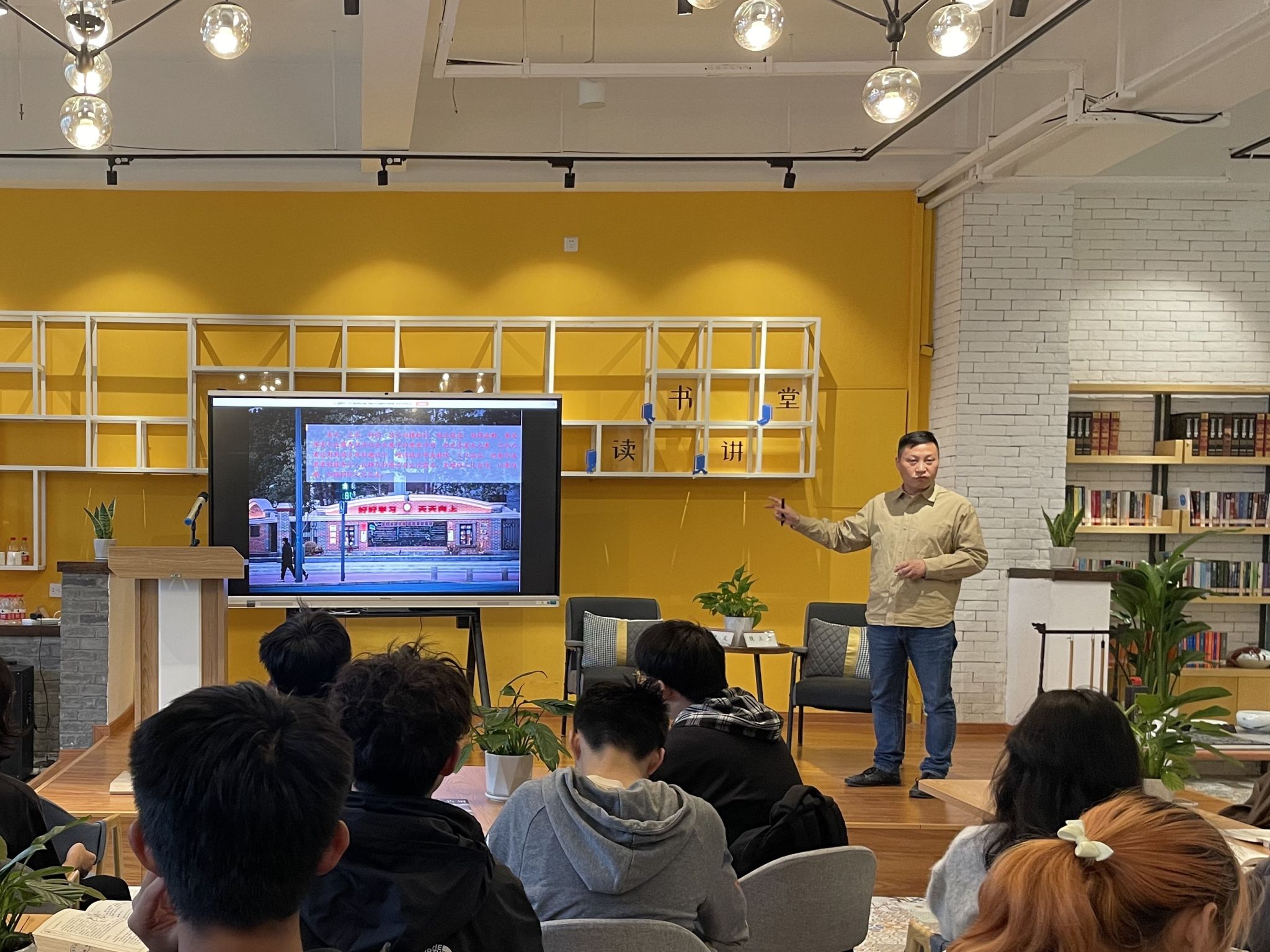 吴道义教授根据读书讲堂中同学们不同的专业背景,用浅显易懂的语言带领他们跨越历史和地域,欣赏现当代造型与艺术设计及古代中国绘画、书法、雕塑之美。他通过这些艺术作品,阐述了传统与时尚虽然在时空上相距很远,但通过再创造,可以将过去、现在和未来连接起来,经开发培育传统的艺术又能再次发芽、开花和结果。他还为同学们推荐了艺术设计的入门图书来进行学习。