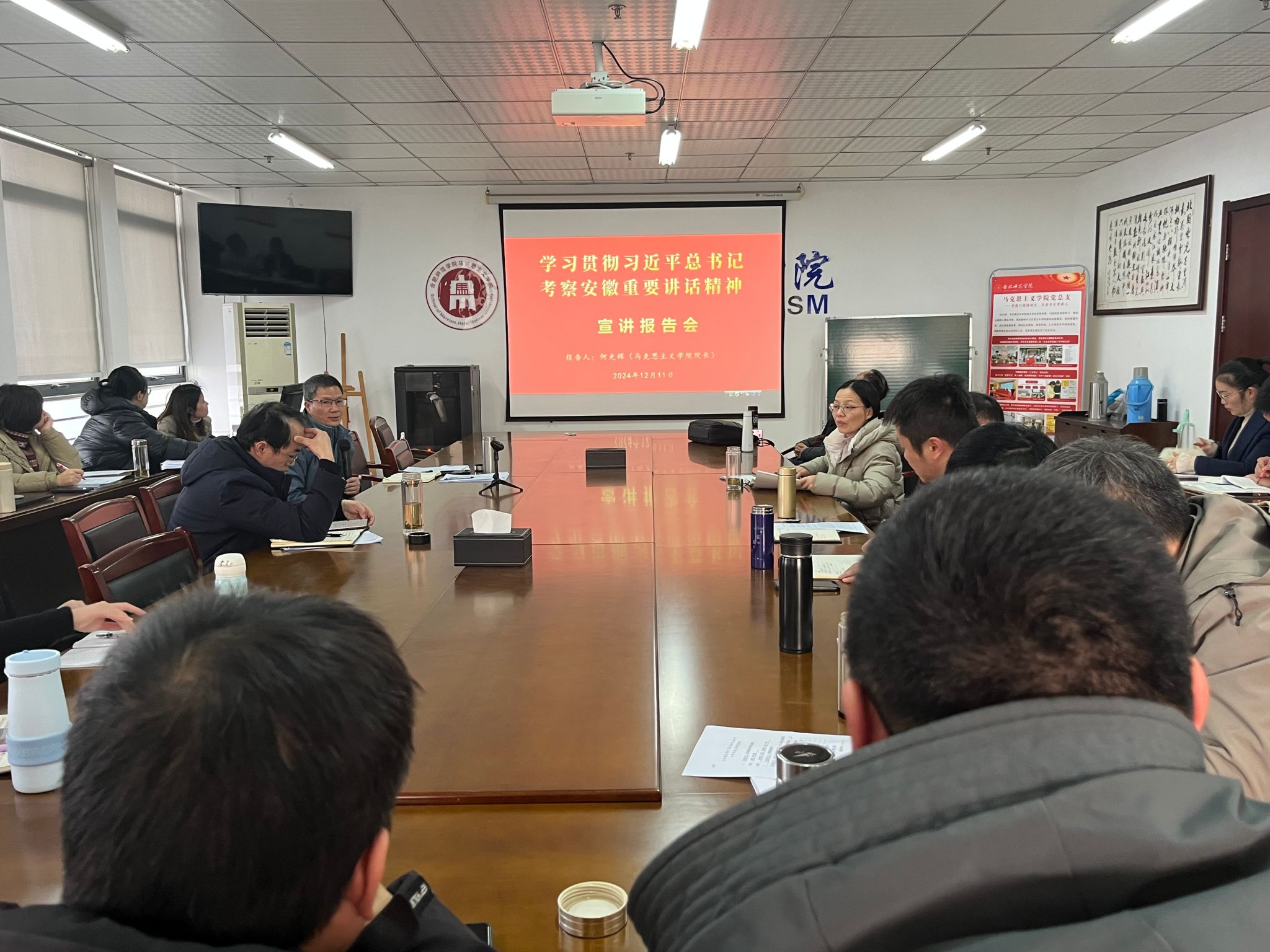 12月11日下午,马克思主义学院学习贯彻习近平总书记考察安徽重要讲话精神宣讲报告会在行知楼1610会议室举行。校级宣讲团成员、院长何光辉作宣讲报告。