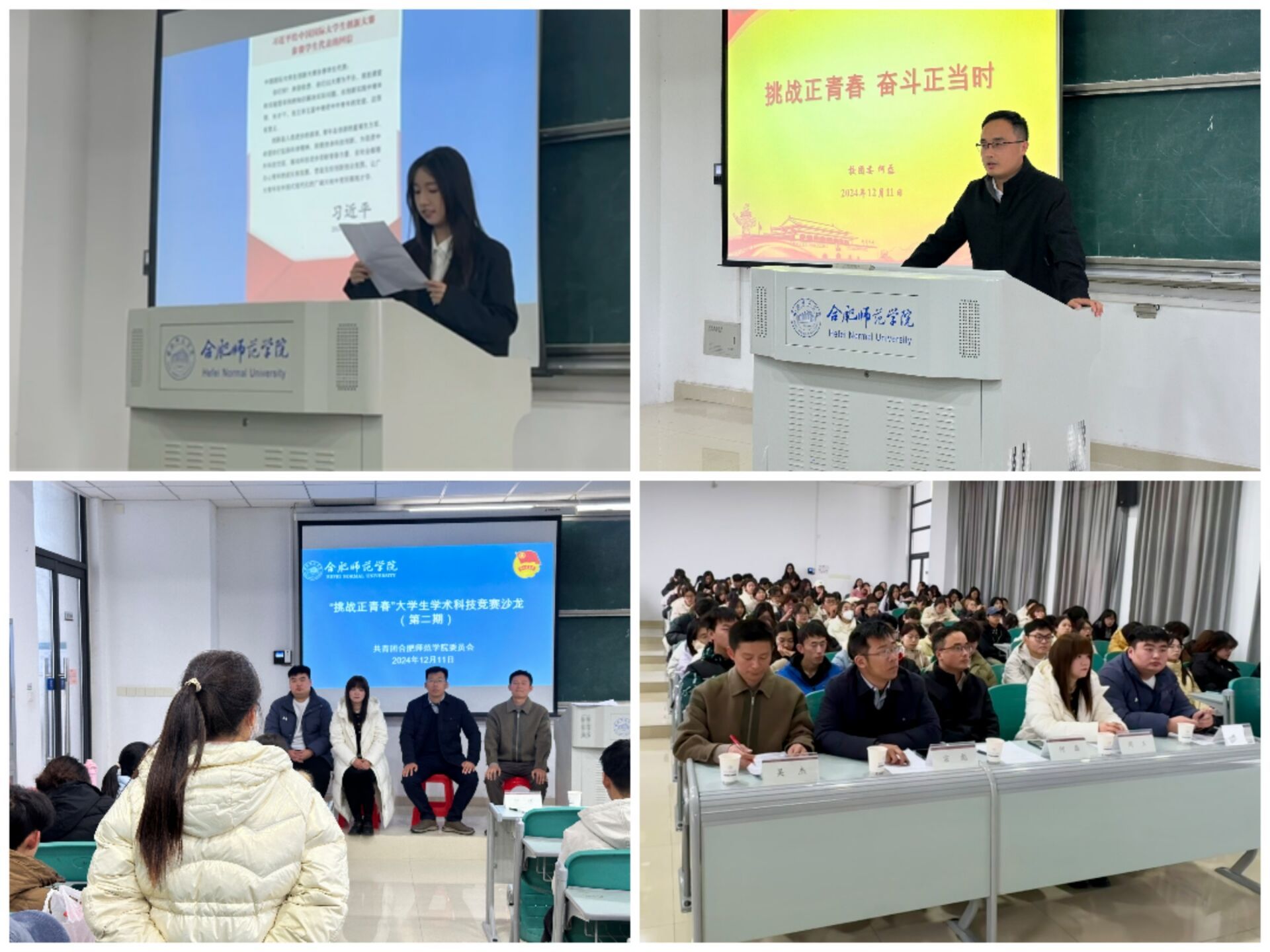 为认真学习贯彻习近平总书记考察安徽重要讲话精神,动员引导青年学生积极参与各类学科竞赛活动,助力应用型人才培养模式改革和质量提升,12月11日下午,院团委在滨湖校区举办第二期“挑战正青春”大学生学术科技竞赛沙龙,活动邀请近年来指导和参与“挑战杯”等学术科技竞赛并取得优异成绩的师生代表参加, 分享创新创业故事和赛事参赛经历。院团委兼职副书记吴杰主持活动,院团委副书记何磊及来自滨湖校区各学院的200余名同学参加活动。