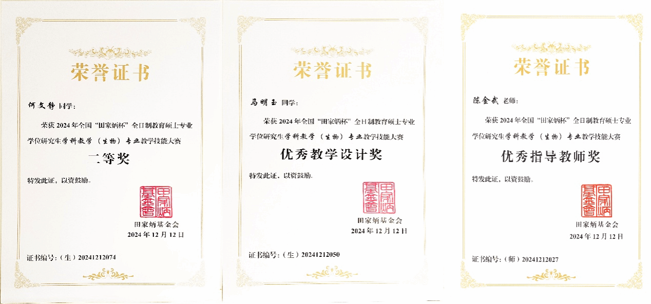 12月12日,2024年全国“田家炳杯”全日制教育硕士专业学位研究生学科教学(生物)专业教学技能大赛决赛在浙江金华圆满落幕。本届赛事由田家炳基金会冠名,浙江师范大学承办。经过激烈的角逐,生物与食品工程学院2023级学科教学(生物)研究生何文静荣获二等奖、马明玉荣获教学设计奖,指导老师陈金武荣获优秀指导教师奖。