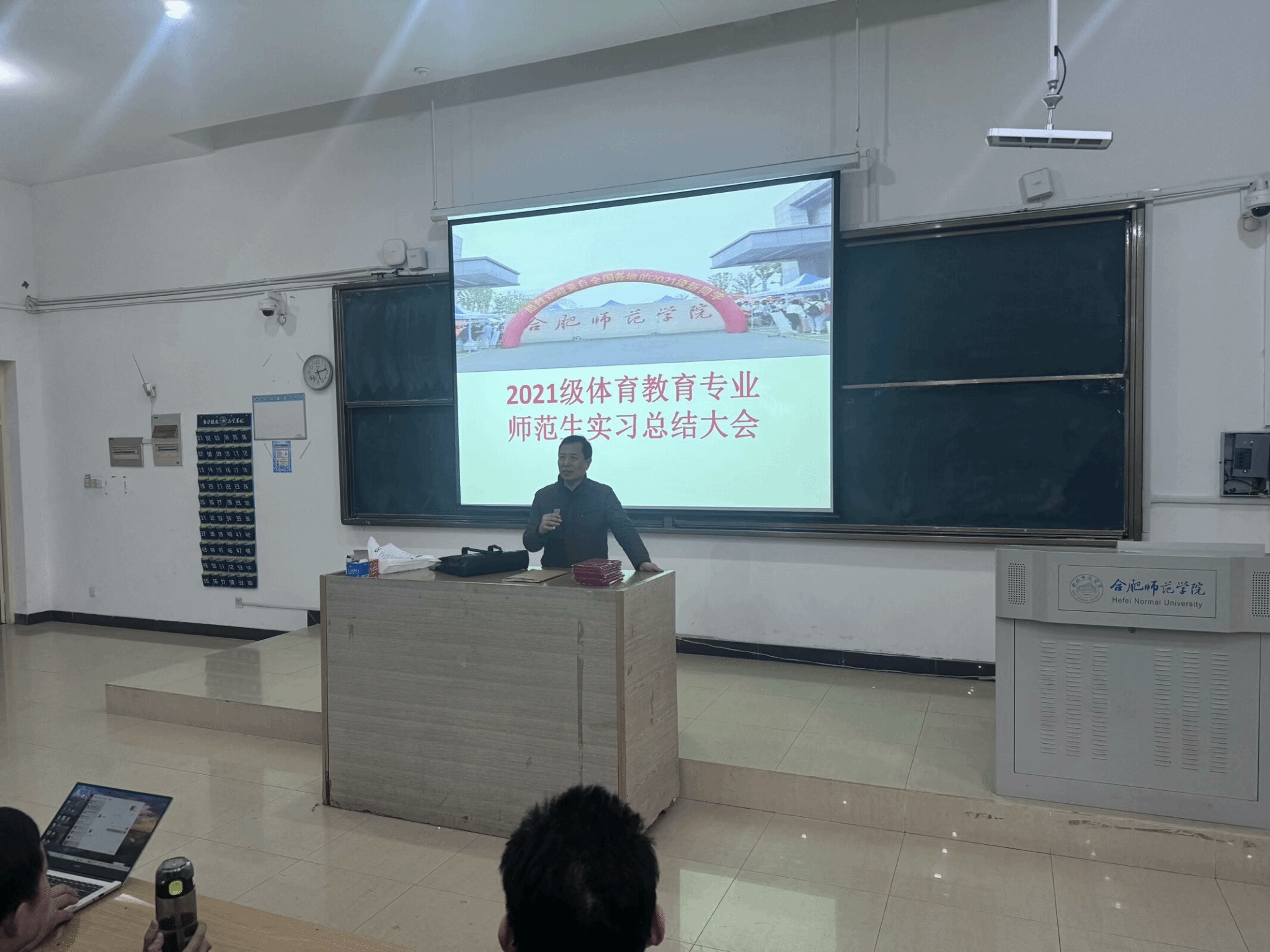 1月8日下午,体育科学学院2021级体育教育专业实习总结大会在博约楼108教室举行。体育科学学院党委副书记王飞,体育教育系主任曹垚、副主任张猛,辅导员陈山山、体育教育系部分教师以及2021级体育教育专业全体学生参加会议。会议由体育教育系副主任陆保云主持。