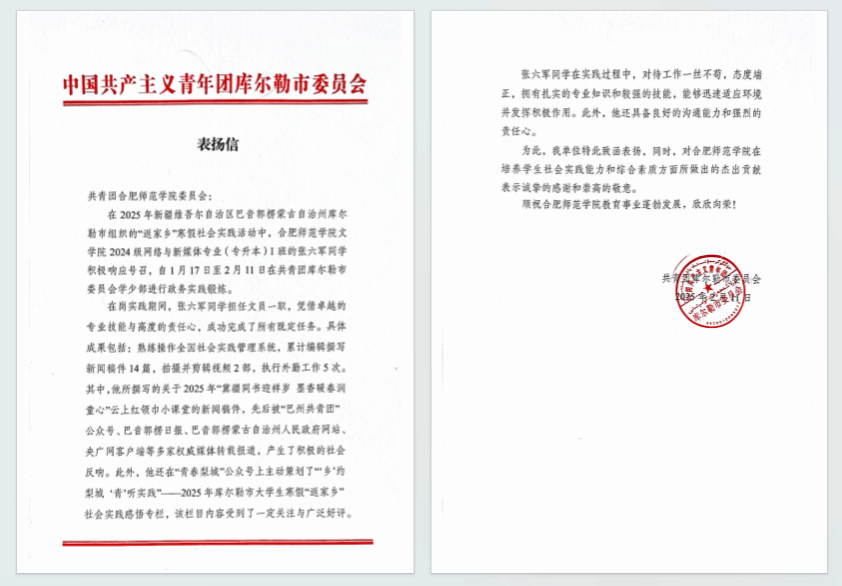 张六军心系家乡,主动联系,被新疆维吾尔自治区巴音郭楞蒙古自治州共青团库尔勒市委员会录用,至学少部进行为期1月的政务实践锻炼。在实践期间,他累计编辑撰写各类宣传稿件14篇,拍摄并剪辑视频2部,高效执行外勤工作5次。其中,他所策划的“乡”约梨城 “青”听实践——2025年库尔勒市大学生寒假“返家乡”社会实践感悟专栏,在“青春梨城”公众号发布后,获得广泛关注与好评;所撰写的关于2025年“云上红领巾小课堂”的新闻稿件,被“巴州共青团”公众号、巴音郭楞蒙古自治州人民政府网站,巴音郭楞日报、央广网客户端等多家权威媒体转载报道,产生了积极的社会影响。实习结束后,库尔勒团市委向学校发来表扬信,信中表示,张六军凭借扎实的专业技能与高度的责任心,圆满完成了多项任务,其表现充分体现了beat365唯一官方网站文学院在培养学生实践能力和综合素质方面的成效,展现了新时代青年的担当与风采。