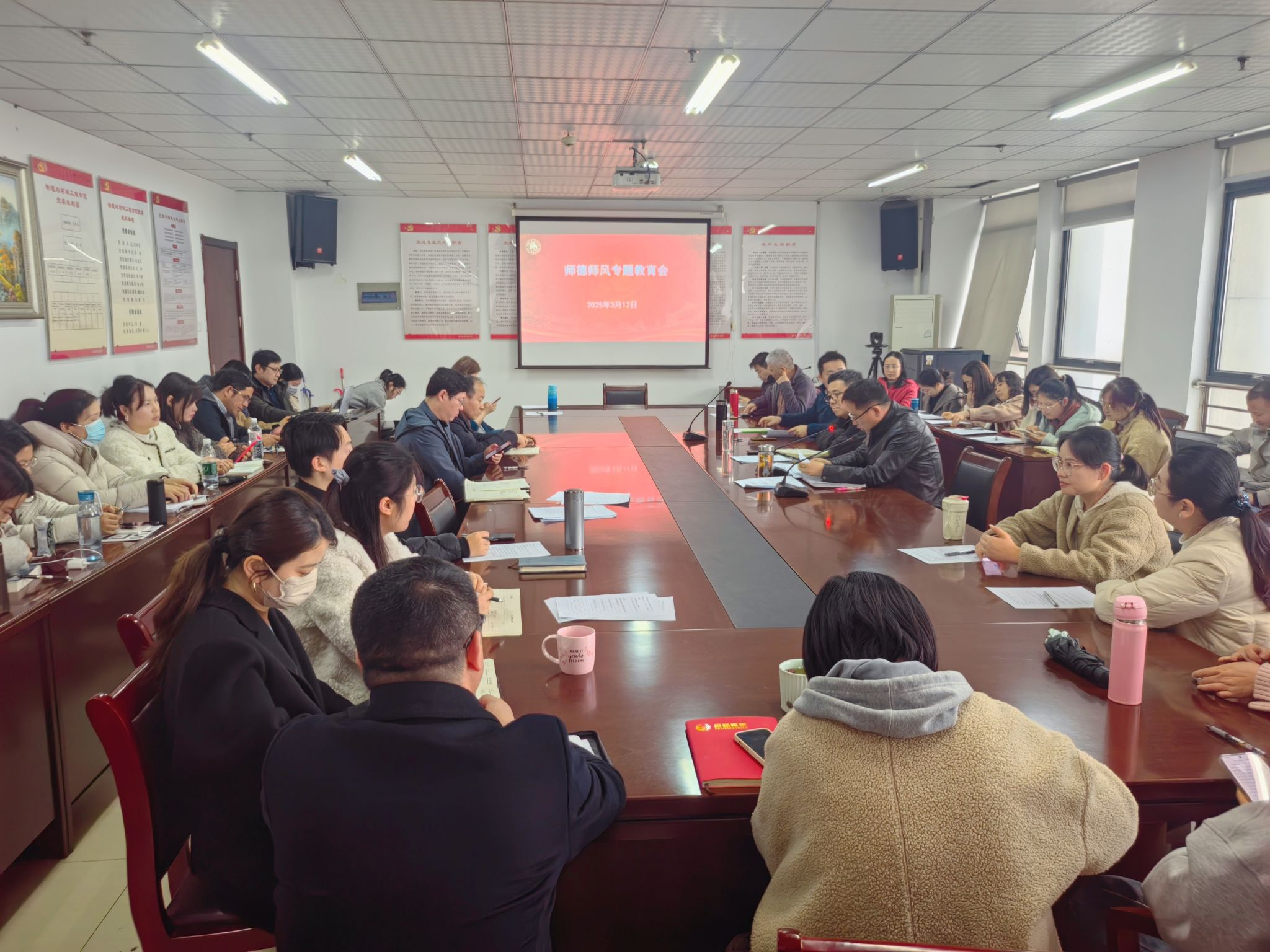 为进一步压实师德师风建设主体责任,进一步加强学院师德师风建设,全面提升教师思想政治素质和师德素养,树立新时代高校教师良好形象,积极营造良好教育环境。3月12日,物理与材料工程学院在行知楼1202会议室组织开展师德师风专题学习教育,学习会由学院党委书记吴震主持,学院全体教职工参会。