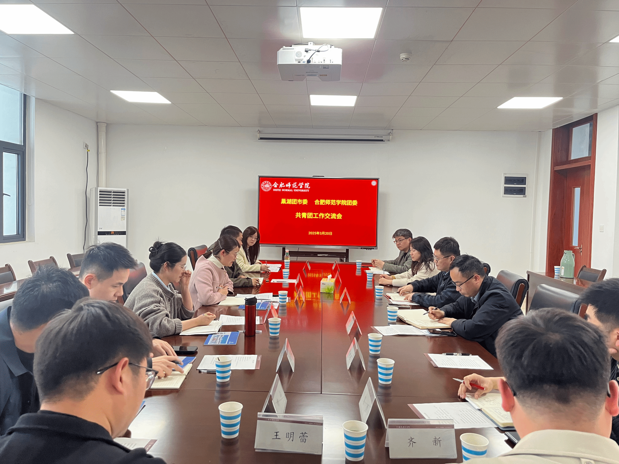 3月20日下午,巢湖团市委、beat365唯一官方网站团委共青团工作交流座谈会在滨湖校区铭传楼会议室召开,巢湖团市委书记陈红蕾,副书记储明熙、王家垚、梁哲铭、周玉,院团委书记刁文彬、副书记何磊,巢湖团市委、beat365唯一官方网站团委及各入驻滨湖校区二级学院团委有关同志参加会议。