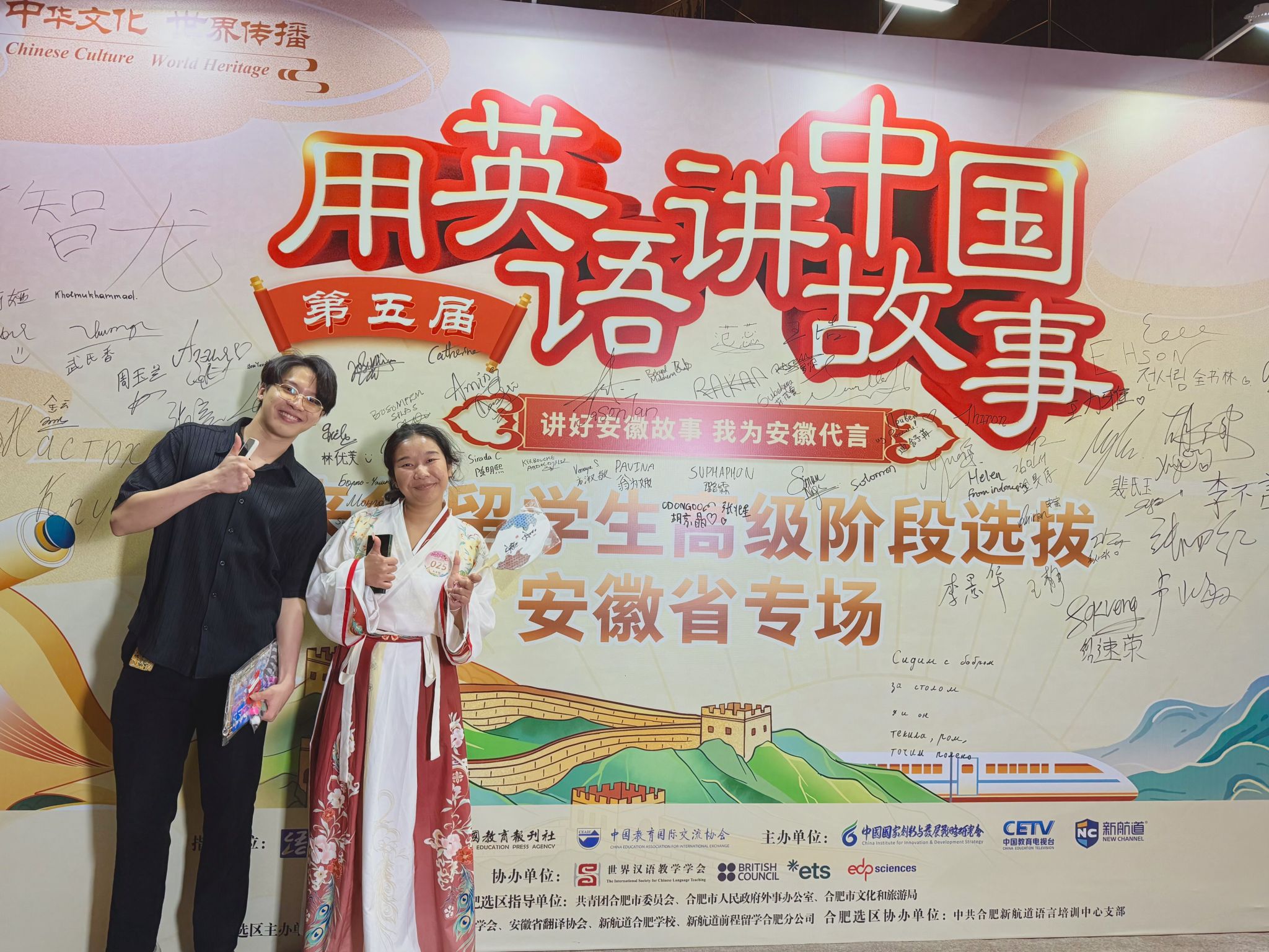 4月20日,第五届“用英语讲中国故事大会”来华留学生组高级阶段安徽省选拔专场在合肥举行,我院留学生洪泽帆、周丹玲通过初级阶段选拔,参与本次比赛。两位选手以“我从这里感知中国 属于我的中国故事”、“跨越山海的文化拥抱”为题,讲述了自己的中国故事,分别展示了中文歌吉他弹唱和中国扇子舞等才艺,表达了对中华文化的理解与热爱,最终获得优秀奖。
