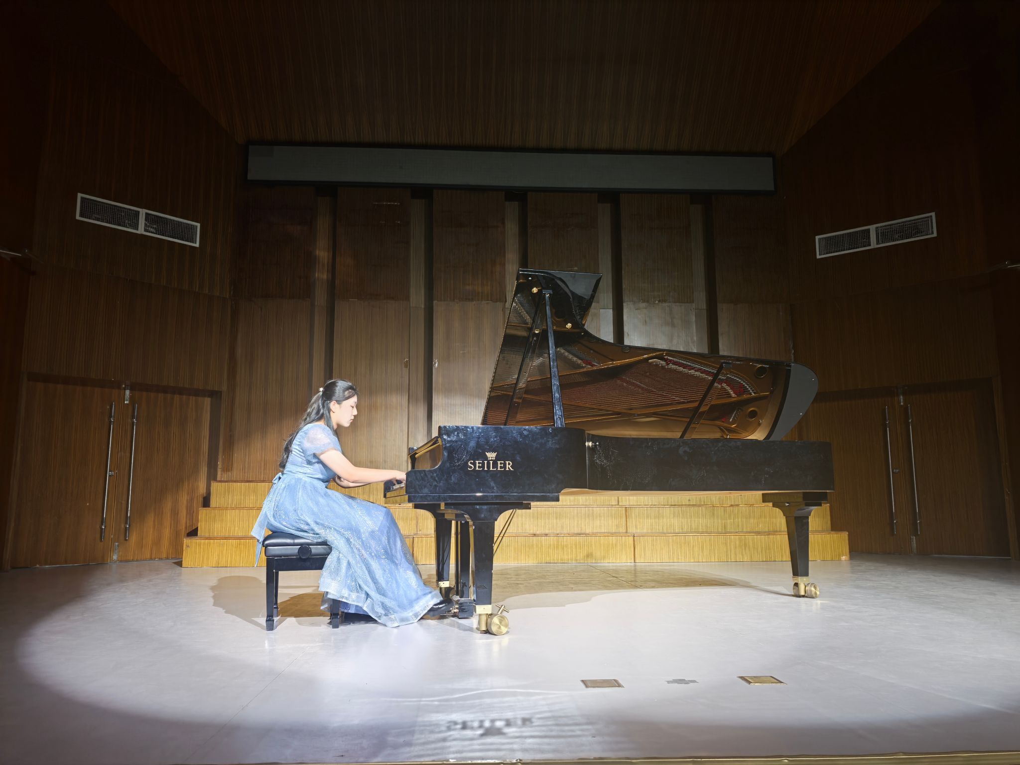 音乐会在2023级学生常斯雨弹奏的《海顿钢琴奏鸣曲Hob.XVI:37第一乐章》中拉开帷幕,之后,《贝多芬钢琴奏鸣曲Op.14No.1第一乐章》、《贝多芬钢琴奏鸣曲Op.31No.3第四乐章》、《莫扎特钢琴奏鸣曲K.576第一乐章》、《海顿钢琴奏鸣曲Hob.XVI:50第一乐章》等18世纪维也纳古典主义音乐三位代表作曲家在不同时期创作的钢琴奏鸣曲先后登场,14名学生以独奏的形式来诠释不同风格、不同体裁的中外钢琴作品。音乐会在2024级学生王梓涵饱含激情演奏的《贝多芬钢琴奏鸣曲Op.81a第三乐章》之后落下帷幕。