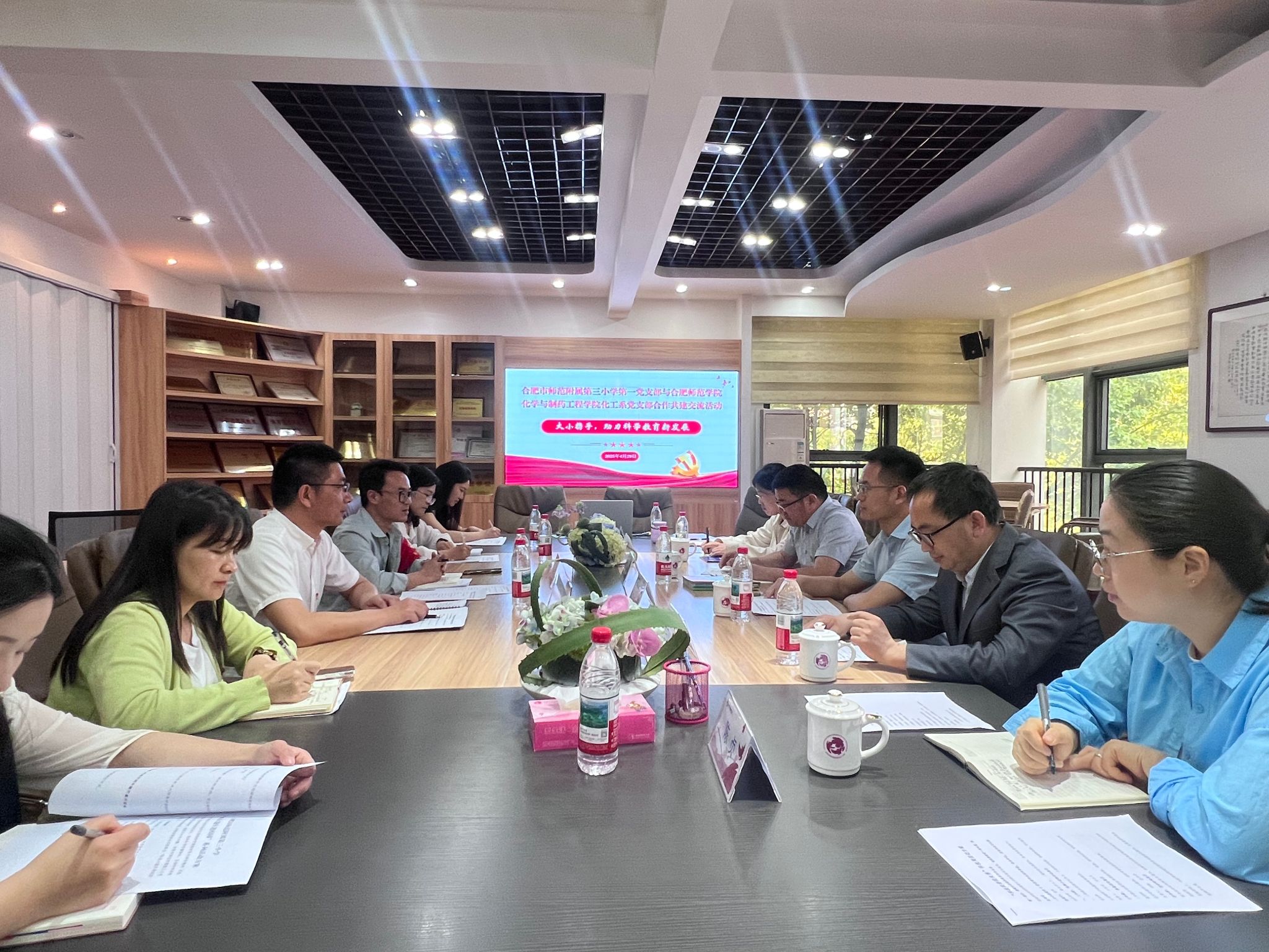 在随后的交流研讨中,双方支部书记分别介绍了党建引领教育服务工作的做法及成效,紧紧围绕合肥师范附属第三小学即将举行的科技周活动展开研讨,并初步规划三大特色项目:“教授科普讲堂”、“小小科学家实验室”和“AI+科学”研学营。
