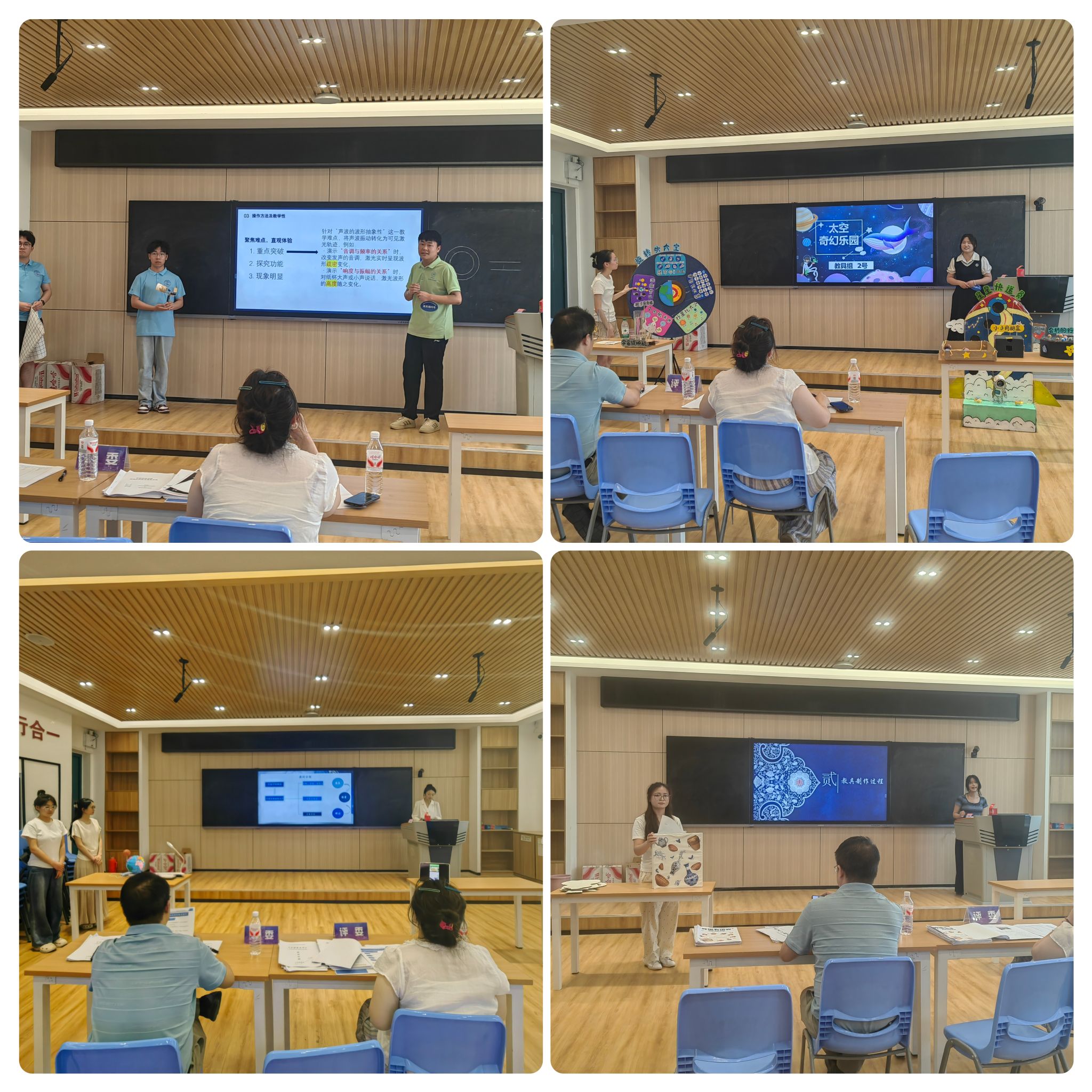 在教具制作竞赛中,共有来自数学与统计学院、马克思主义学院、教育与心理科学学院、化学与制药工程学院、物理与材料工程学院、生物与食品工程学院、美术与设计学院等7个二级学院的19组团队参赛。竞赛过程中,选手们通过PPT汇报与作品演示两个环节,采用图文并茂的方式从研究背景、创新思路、材料选择、制作方法等方面展开介绍并现场演示,随后评委提问参赛选手针对提问进行了答辩,评委认真聆听各参赛队伍的汇报,对项目提出了很多建设性意见。