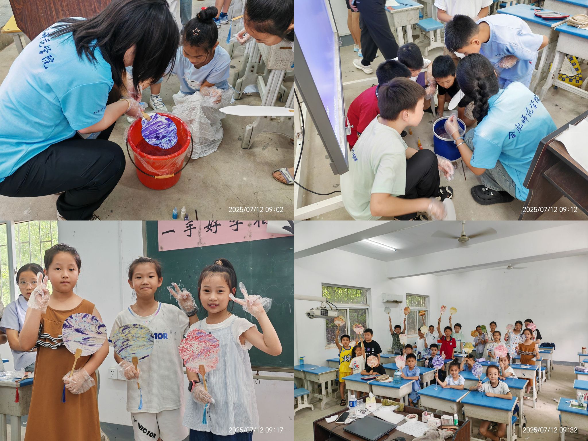 近年来,漆扇教学逐渐成为连接传统工艺与现代教育的重要纽带。行知学堂“小先生”通过图片、视频讲解、具体操作让小学员了解漆扇及制作过程。在漆扇课上,“小先生”让小学员们将传统工艺和审美相结合,小学员们可以选取自己喜欢的颜色和扇子形状,缓慢将扇子浸入有颜料的水桶中,将白扇进行染色,小学员们也可以对白扇进行绘画,开发自己的想象力和动手能力,制作出属于自己独一无二的漆扇。漆扇教学已形成“教学—创作—展示—转化”的完整生态。从校园里的一笔一画,到生活中的一扇一景,漆扇教学正以鲜活的方式,让传统工艺走出博物馆,成为连接过去与未来的文化纽带。