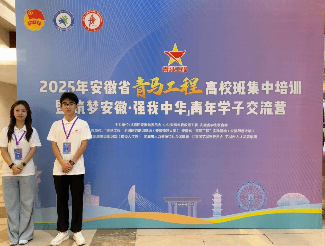 2025年安徽省“青马工程”高校班集中培训暨“筑梦安徽·强我中华”青年学子交流营在安徽芜湖成功举办。我院选派学生会主席团成员方轶昕、黄绍军两位同学,在8月26日至29日期间与来自全省119所高校的200名青年大学生一同参加集中学习培训参训。院团委为本院学员安排了1名“青马工程”导师,提供全程指导与培养支持。