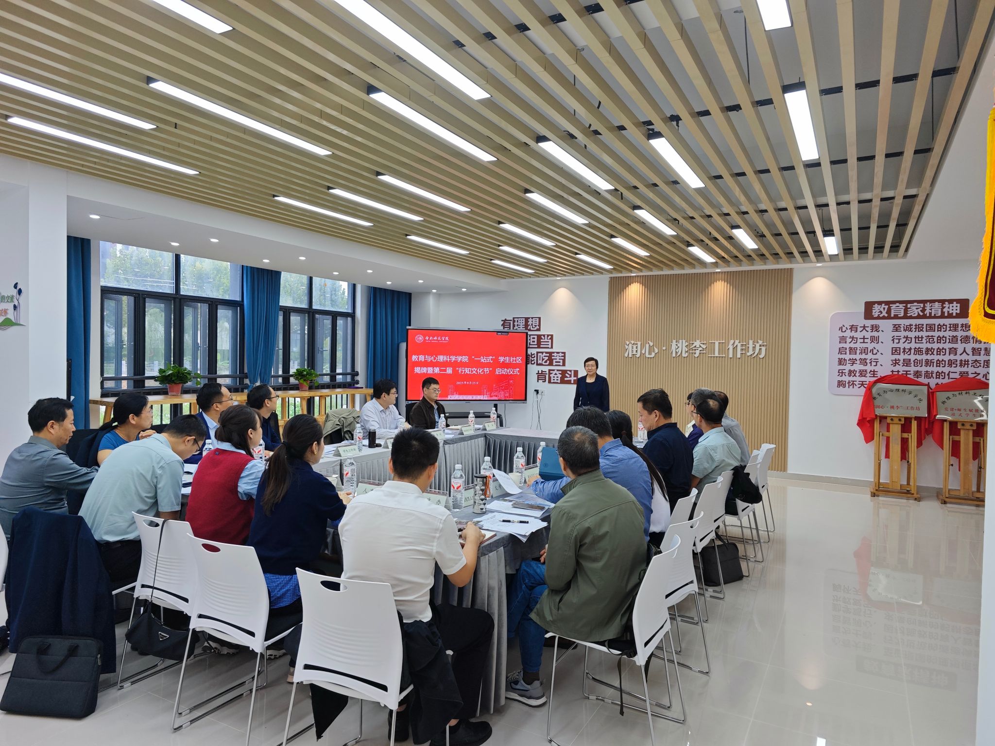 9月25日,教育与心理科学学院“一站式”学生社区揭牌暨第二届“行知文化节”启动仪式在滨湖校区12栋104室“润心·桃李”工作坊隆重举行。学院党委副书记梁立昌出席仪式,相关职能部门与二级学院负责人参加活动。启动仪式由教育与心理科学学院党委书记董萍主持。