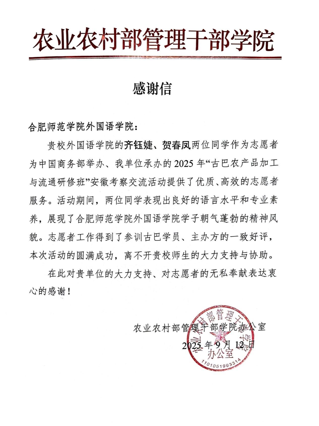 9月9日至11日,商务部举办、农业农村部管理干部学院承办的2025年“古巴农产品加工与流通研修班”安徽考察交流活动在合肥举行。活动期间,外国语学院2022级西班牙语班齐钰婕和贺春凤同学作为外语志愿者全程参与,为古巴学员提供专业语言服务与行程协助。