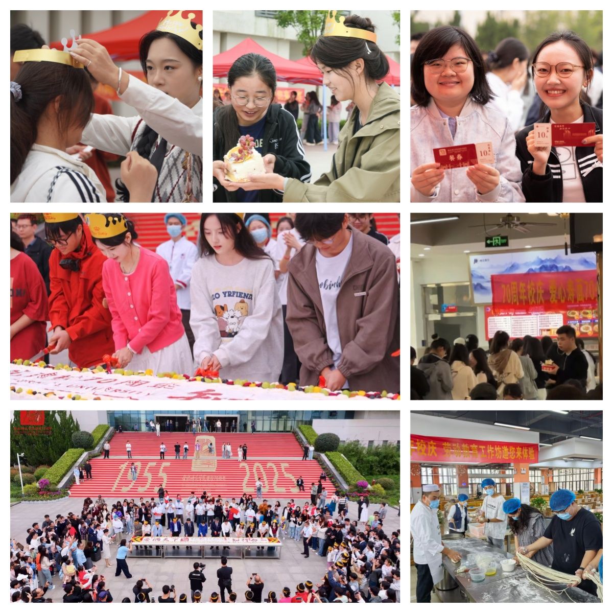 为丰富校庆活动形式,营造喜庆、温馨、祥和的校庆氛围,让全体在校师生与返校校友在味蕾间重温校园记忆,学校精心策划了“食堂喊您---切蛋糕、吃寿面;玩游戏、赢奖品!”活动,主要包含“劳动教育工作坊邀您体验面点制作工艺”“手牵手同心共庆生日歌”“幸运转盘乐赢免费校庆餐”“十万优惠餐券送师生”“爱心寿面”70分(0.7元)购等活动。活动吸引了两校区近2万名师生参与。