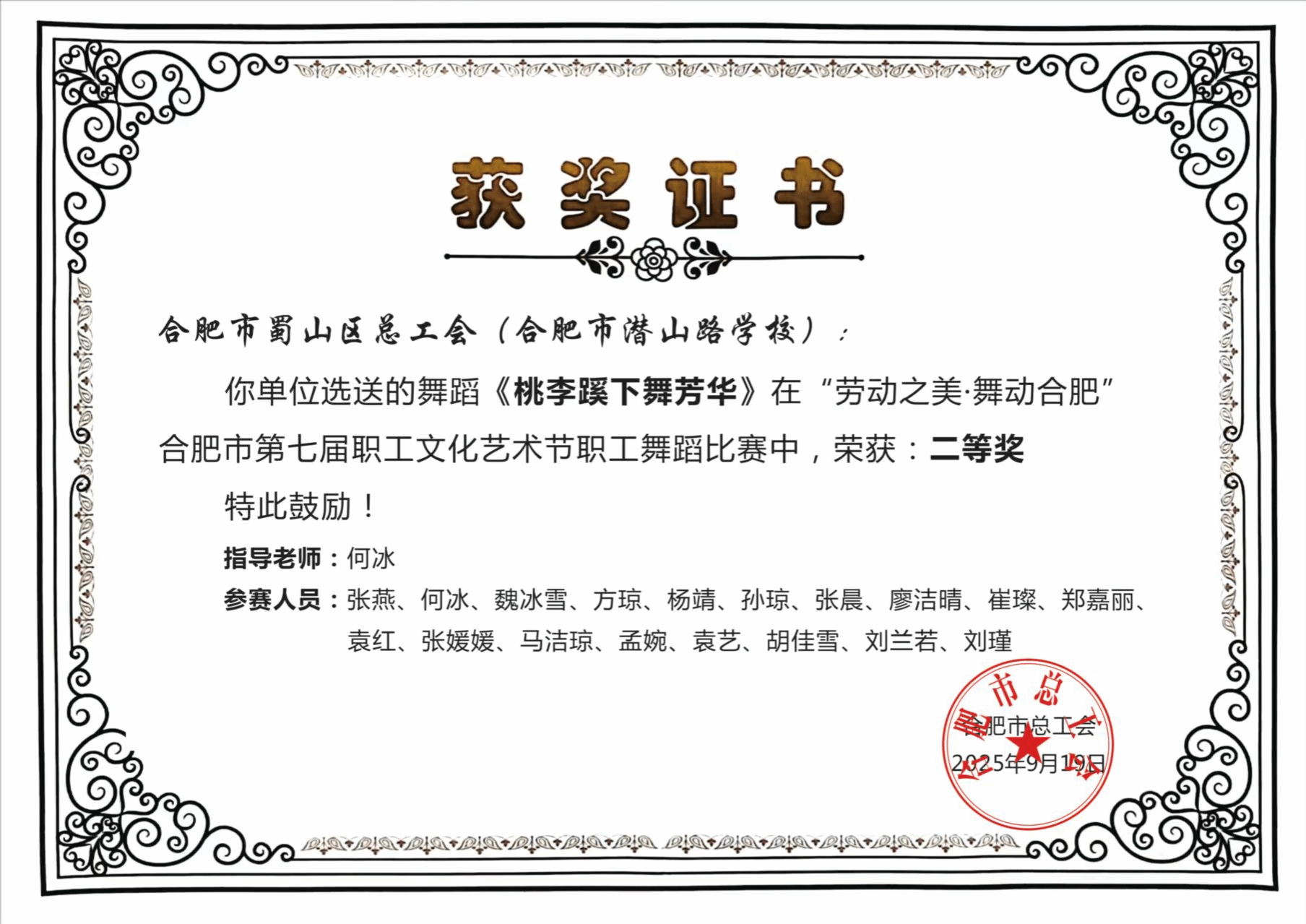 近日,合肥市第七届职工文化艺术节“劳动之美,舞动合肥”职工舞蹈比赛圆满落幕。beat365唯一官方网站音乐学院教师何冰在合肥市潜山路学校挂职副校长期间,带领该校教师团队编排的舞蹈《桃李蹊下舞芳华》凭借精湛的艺术呈现与深刻的内涵表达,从众多参赛作品中脱颖而出,最终斩获比赛二等奖。