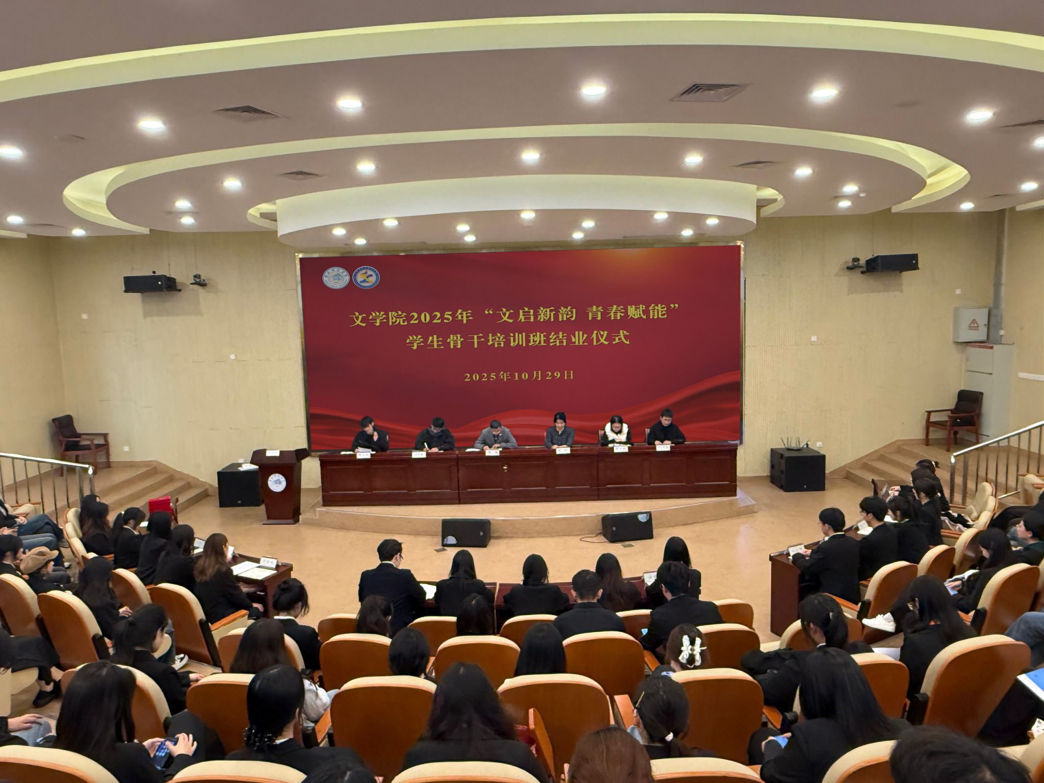 10月29日下午,文学院在滨湖校区学术报告厅举行“文启新韵 青春赋能”学生骨干培训班结业仪式暨优秀学生干部表彰大会。学院党委书记许锃,党委副书记、纪委书记夏娟,辅导员李惠恩、曹甜甜、王明蕾、潘文峰与全体学生干部共同见证收获时刻。