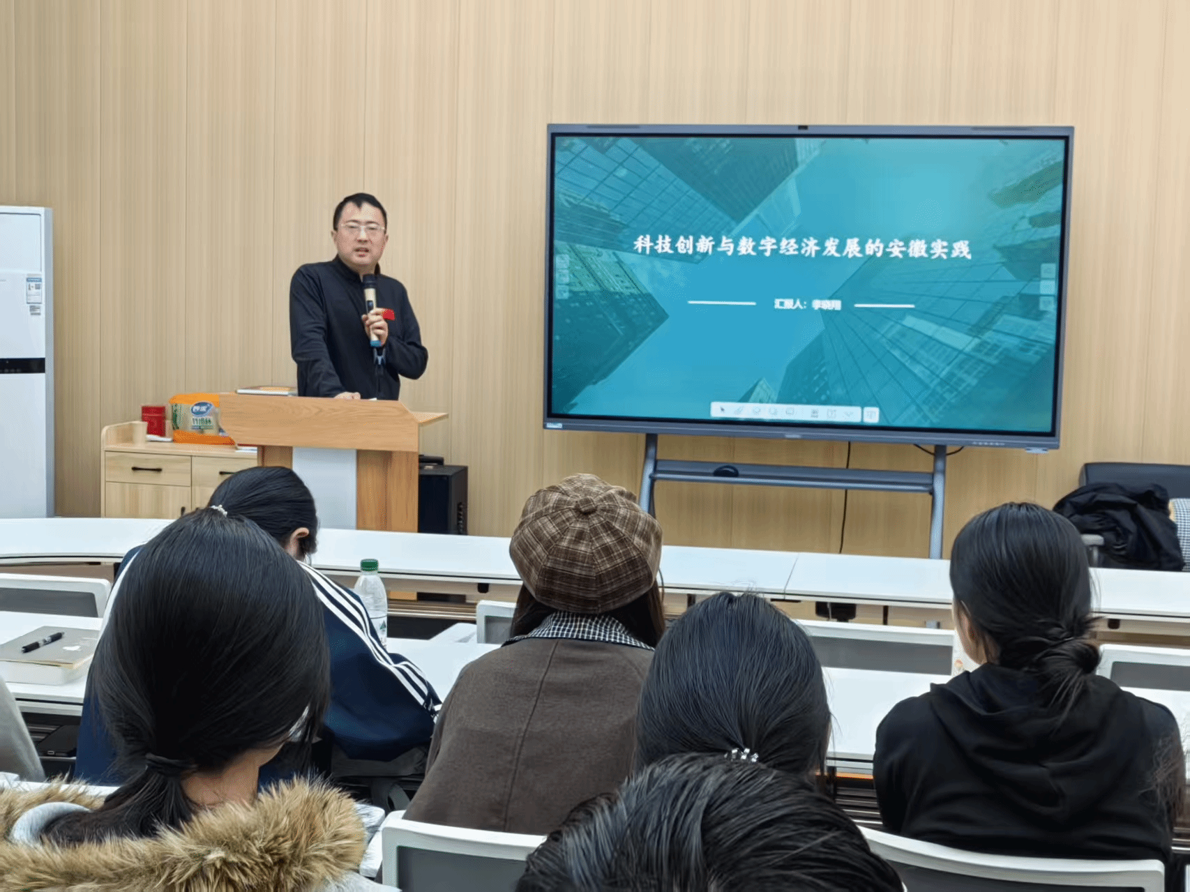 11月5日,为进一步丰富滨湖校区学生校园文化建设,增长学生学术学识视野,滨湖校区“阅+历”读书讲堂第四课如期开课。本次主讲嘉宾是学校经济与管理学院院长、博士生导师李晓翔院长,演讲主题是“科技创新与数字经济发展的安徽实践”。主持人是校园阅读推广人万诗婕,读书讲堂的选课同学全员参与。