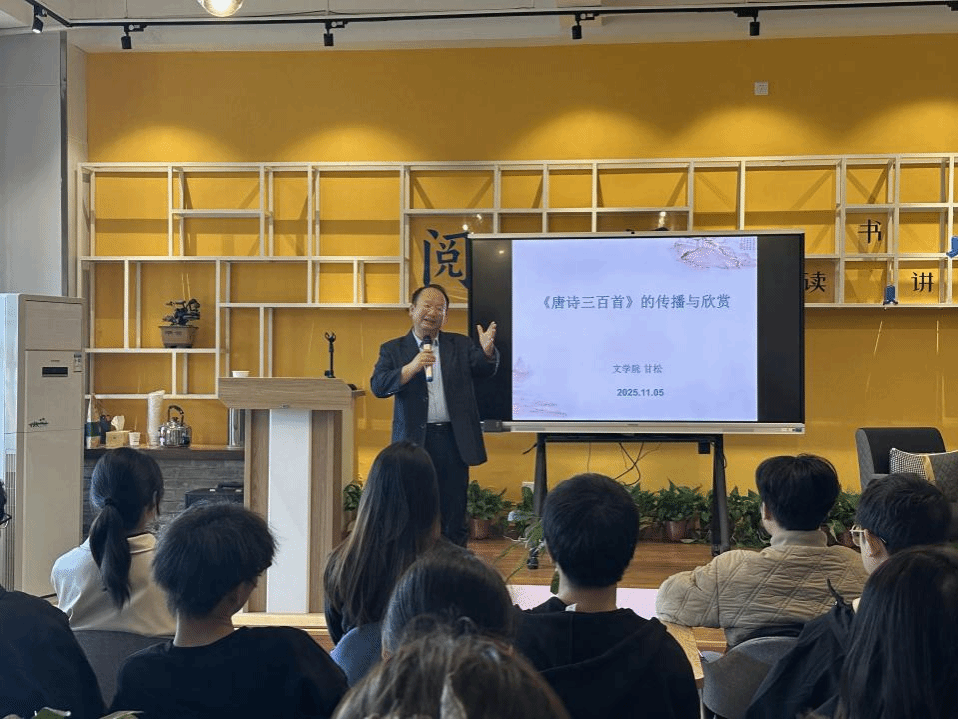 讲座伊始,甘松教授以一句“你读过《唐诗三百首》吗?”引发全场共鸣,随后讲座围绕唐诗选本演变、《唐诗三百首》编选智慧、跨时空传播路径及实用欣赏方法展开,设置诗词问答、意境赏析等环节,鼓励学生主动分享感悟,在思想碰撞中深化对唐诗的理解,沉浸式感受盛唐诗歌的璀璨魅力。