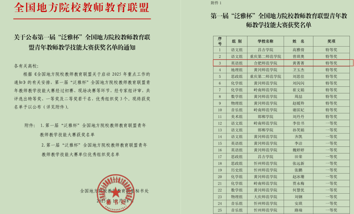 近日,由全国地方院校教师教育联盟主办,肇庆学院承办的首届“泛雅杯”全国地方院校教师教育联盟青年教师教学技能大赛决赛,在广东省肇庆学院落下帷幕。大赛以“深化教师教育改革,服务教育强国建设”为主题,决赛设置课堂教学、主题演讲与现场答辩三个环节,全面考察教师教育教学综合素质。经过激烈的角逐,beat365外国语学院黄菁菁老师荣获英语组特等奖、音乐学院谢梦珂老师荣获音乐组二等奖。
