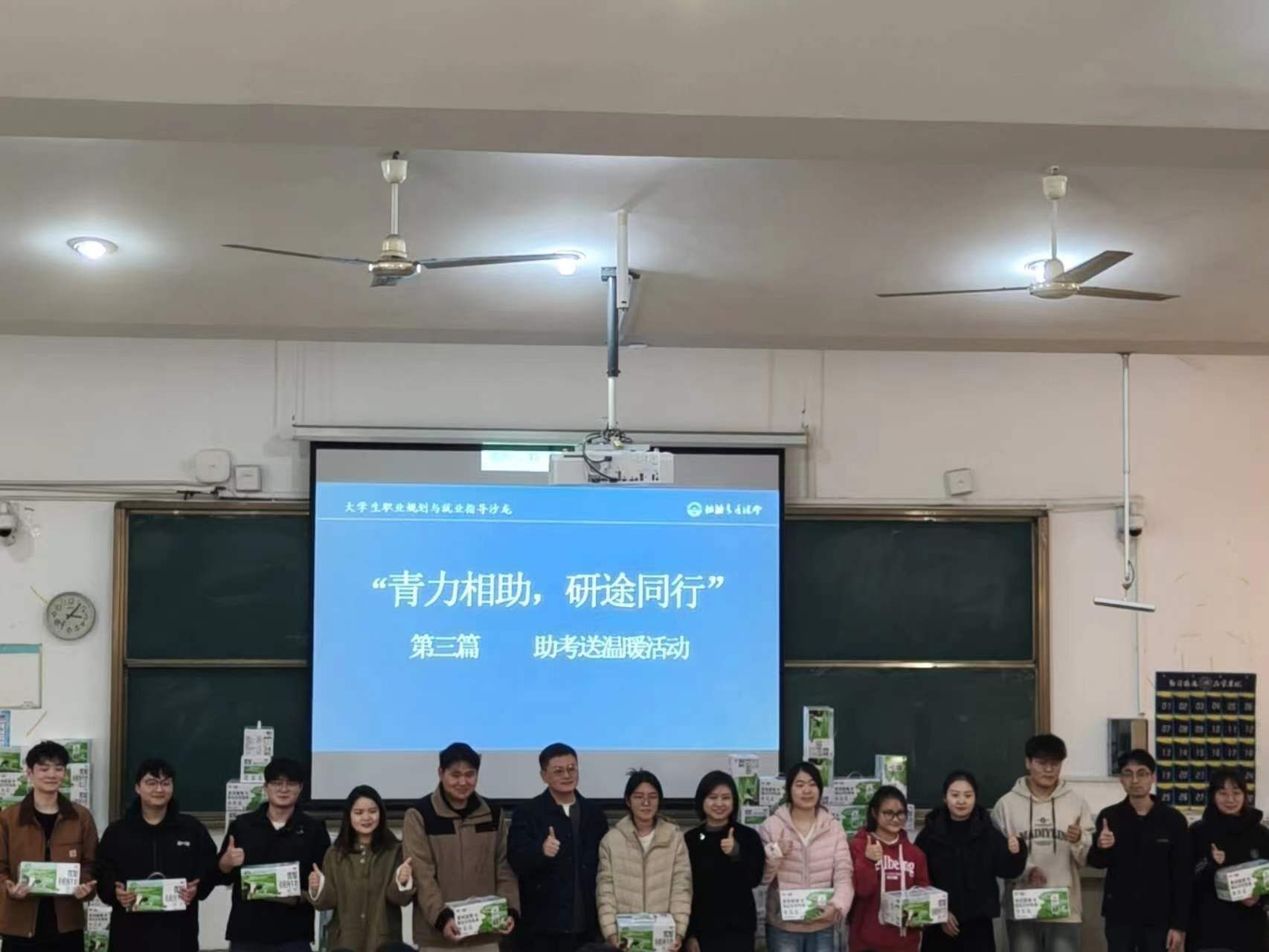 各毕业班辅导员结合自身经验和所带学生的具体情况,进行了细致入微的考前指导。他们从考前作息调整、答题技巧、考场心态、物品准备等多个方面给予了实用建议,叮嘱同学们在最后冲刺阶段要回归基础、保持手感,更要相信自己长期以来的努力与积累。辅导员们语重心长的叮嘱和关怀,让在场学子倍感温暖与鼓舞。动员环节结束后,活动现场进入了温馨的“送温暖”环节。学院领导与老师们一同将精心准备的“助考加油包”——代表健康与关怀的暖心牛奶,送到每一位考研学子手中。一盒盒牛奶,承载的是学院对学子们身体健康的关切,更是“一杯奶,一份情,一股劲”的深切寓意,希望同学们补充营养,精力充沛地完成最后的冲刺。