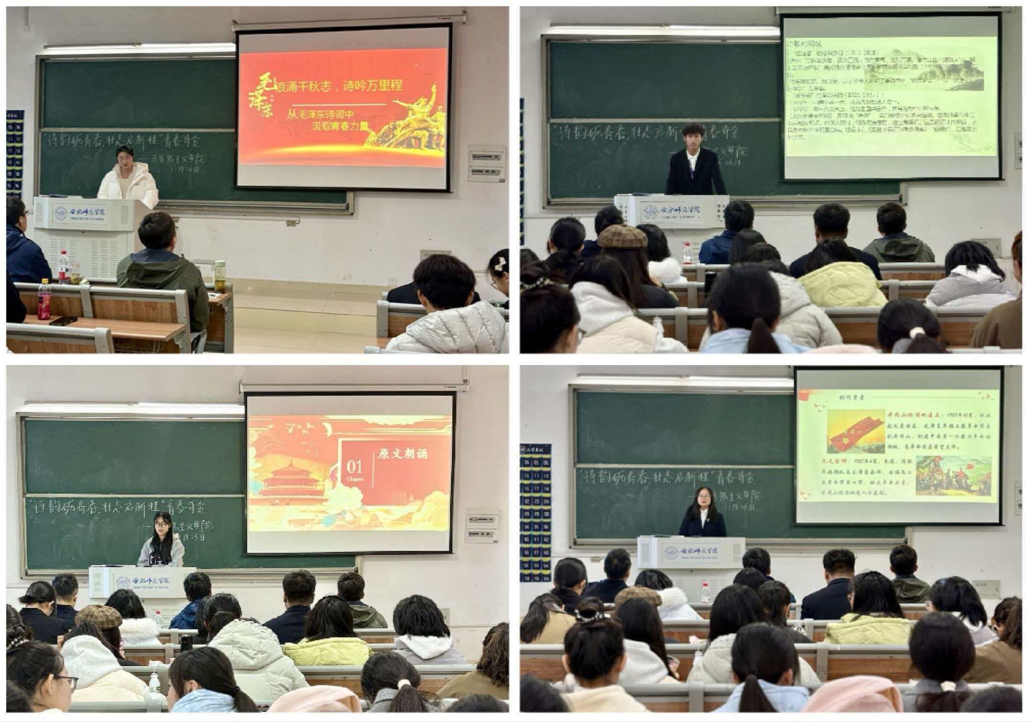张军占、郝嘉乐在点评时指出,此次活动实现了诗词文化与思想政治教育的深度融合,打造了一堂沉浸式、体验式的思政实践课;不仅展现了同学们的巧思创意与扎实准备,彰显了学子对毛泽东诗词的深刻理解与对革命精神的精准把握,更融入了新时代青年的独特视角,体现出深厚的人文素养与鲜明的思想底色。希望同学们以诗会为契机,通过深度阅读进一步挖掘革命历史内涵,汲取精神养分。