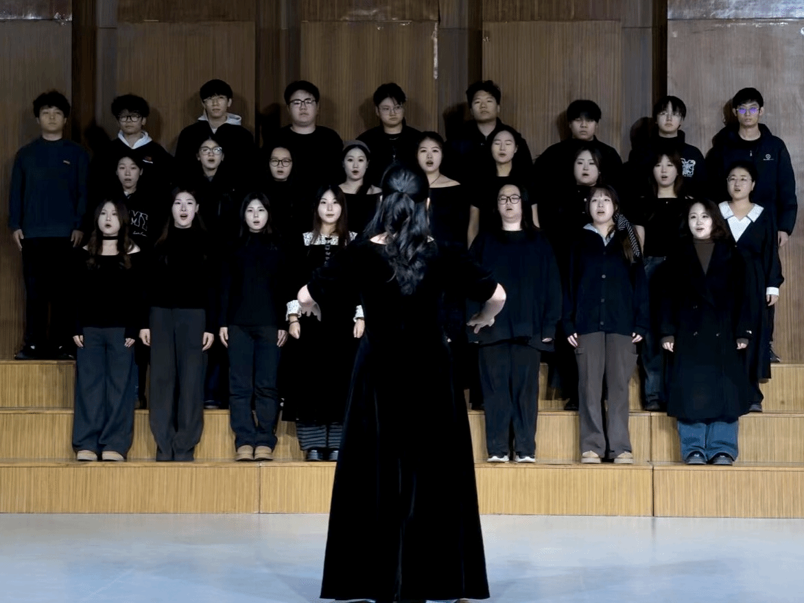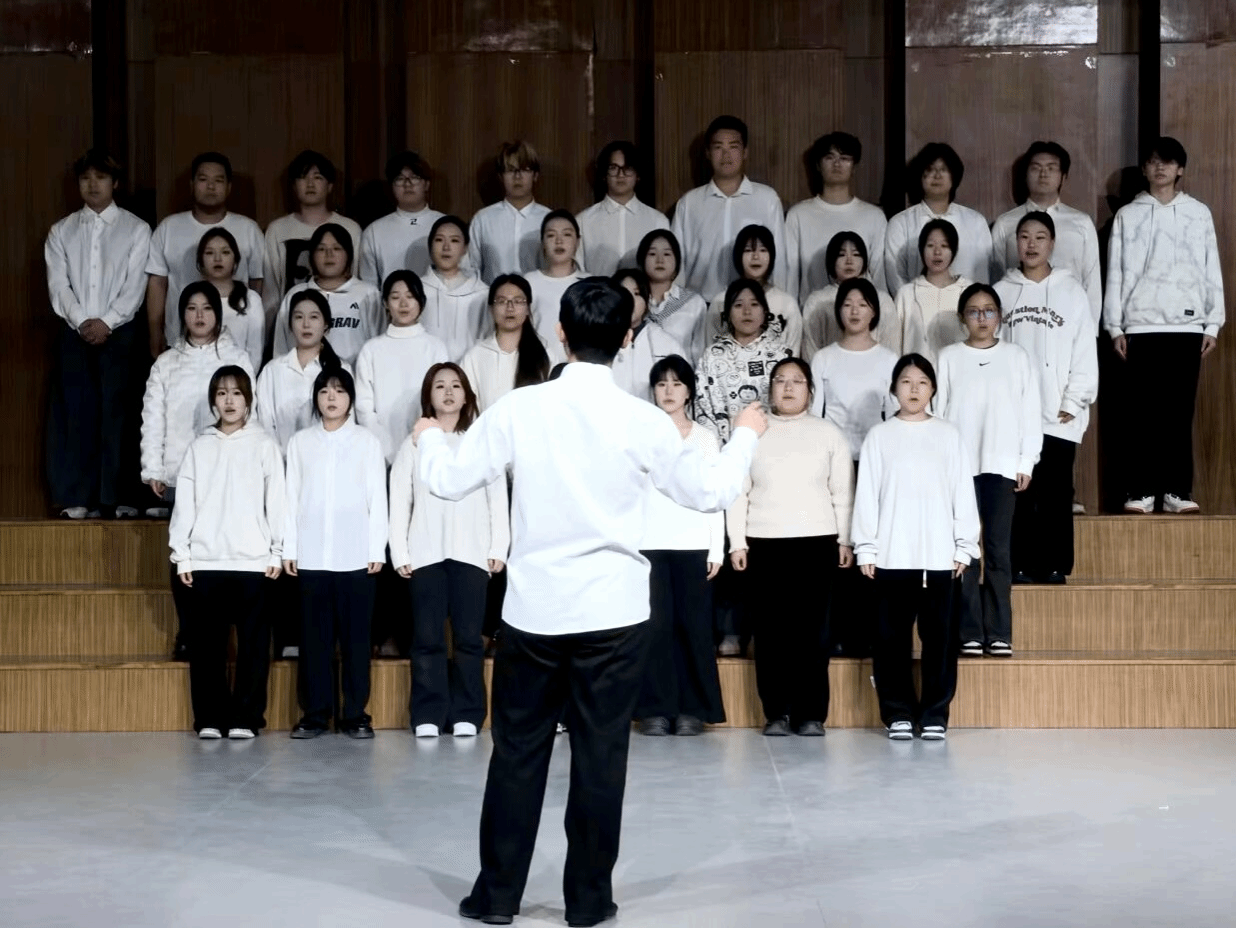 在暖光与旋律交织之中,青春之声与历史回响深情共振,各班以歌为媒,将峥嵘岁月谱入时代旋律,用铿锵和声点燃民族记忆。比赛开始,主持人报幕后,当第一个音符撞进耳朵,青春的礼赞便与历史的回响交织——25级音乐学1班以《灯火里的中国》率先登场,把万家暖光揉进轻柔和声,紧随其后,25级音乐学2班的《歌唱祖国》每句都裹着滚烫的心跳,25级音乐学3班的《保卫黄河》声部碰撞如浪涛拍岸般壮阔,25级音乐学4班的《我和我的祖国》温柔里藏着最坚定的眷恋,25级音乐表演1班与2班共同带来的《紫荆花盛开》婉转腔调里漾着烟火人间的暖,轻吟间是藏不住的深情,25级音乐学专升本班以《如愿》把期许织进了每个咬字里。