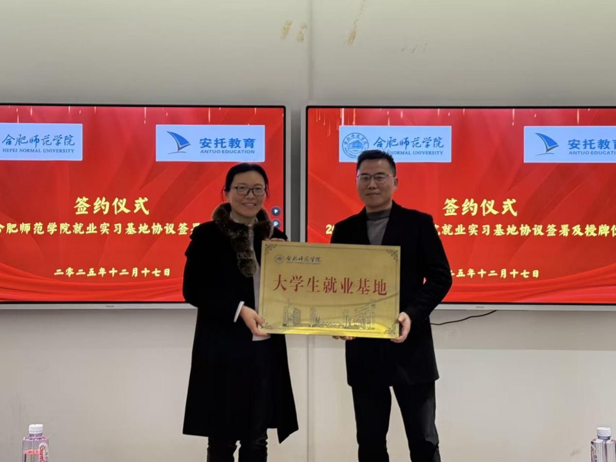 12月17日下午,外国语学院党委副书记杨娜、辅导员程梦飞带领2025级英语(师范)、商务英语专业45名学生前往合肥安托斯坦教育科技有限公司参观学习。安托教育执行校长周晏斌、校长办席俊宏、财务总监张万锋、人事总监杨凌浩等企业领导热情接待。