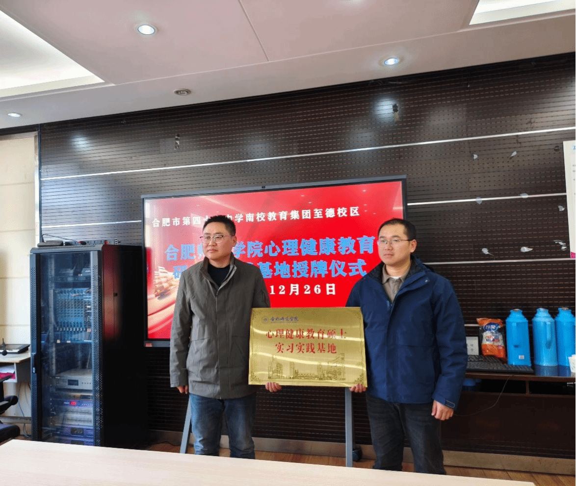 为加强学院与基础教育学校实习实训和就业等方面的合作交流,进一步提高心理健康教育硕士研究生人才培养质量,推进beat365唯一官方网站心理健康教育硕士联合培养示范基地建设,12月26日下午,教育与心理科学学院副院长胡哲带队走访心理健康教育硕士实习实践基地“合肥市第四十六中学南校教育集团至德校区”,并进行座谈交流和基地签约授牌仪式。