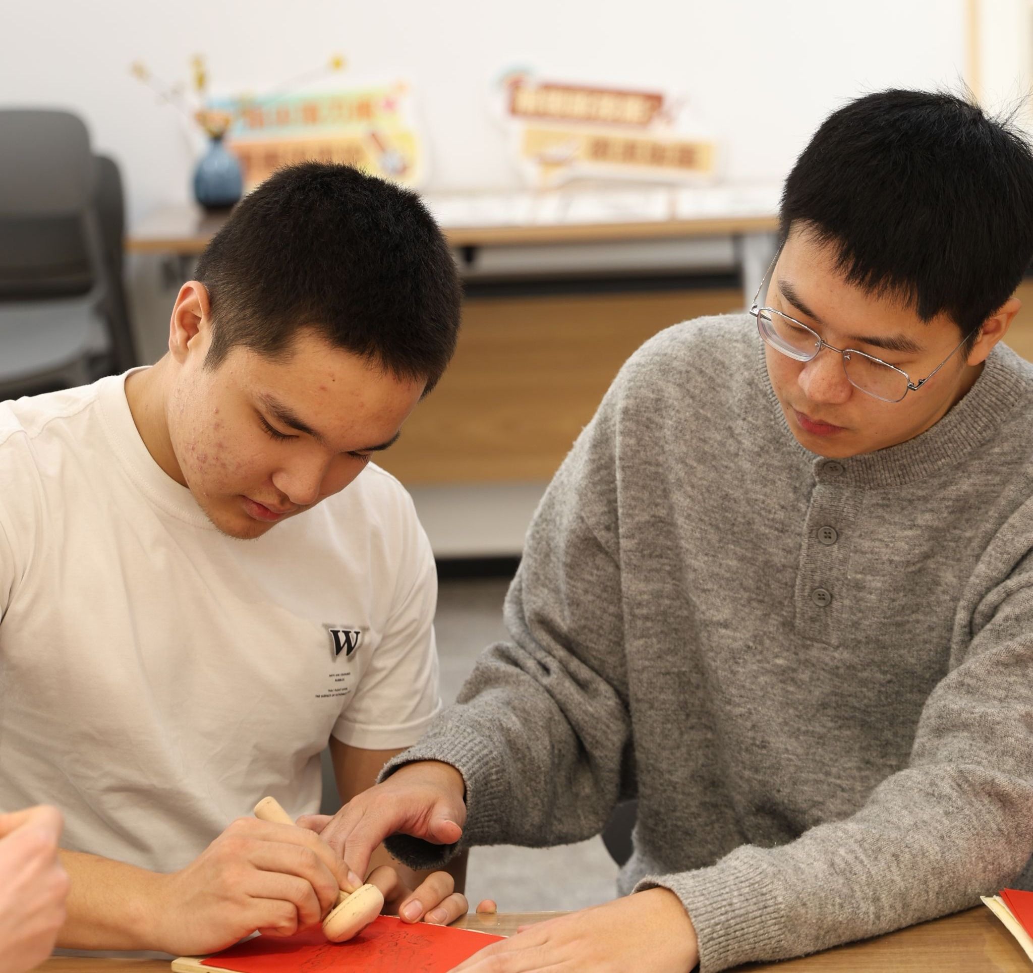 马年将至,版画基地准备了具有新春特色的版画样式,留学生们在学生志愿者的帮助下,动手体验版画拓印,一张张红彤彤的新春福字、“马上有福”、“马到成功”主题版画跃然纸上,将非遗技艺与新春祝福巧妙融合。留学生在动手实践中读懂了中华传统文化里的吉祥寓意。