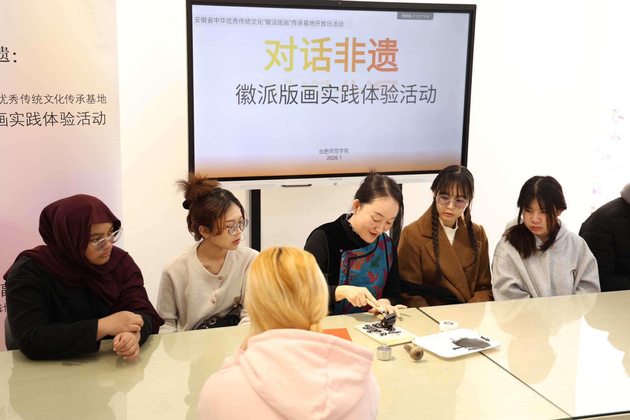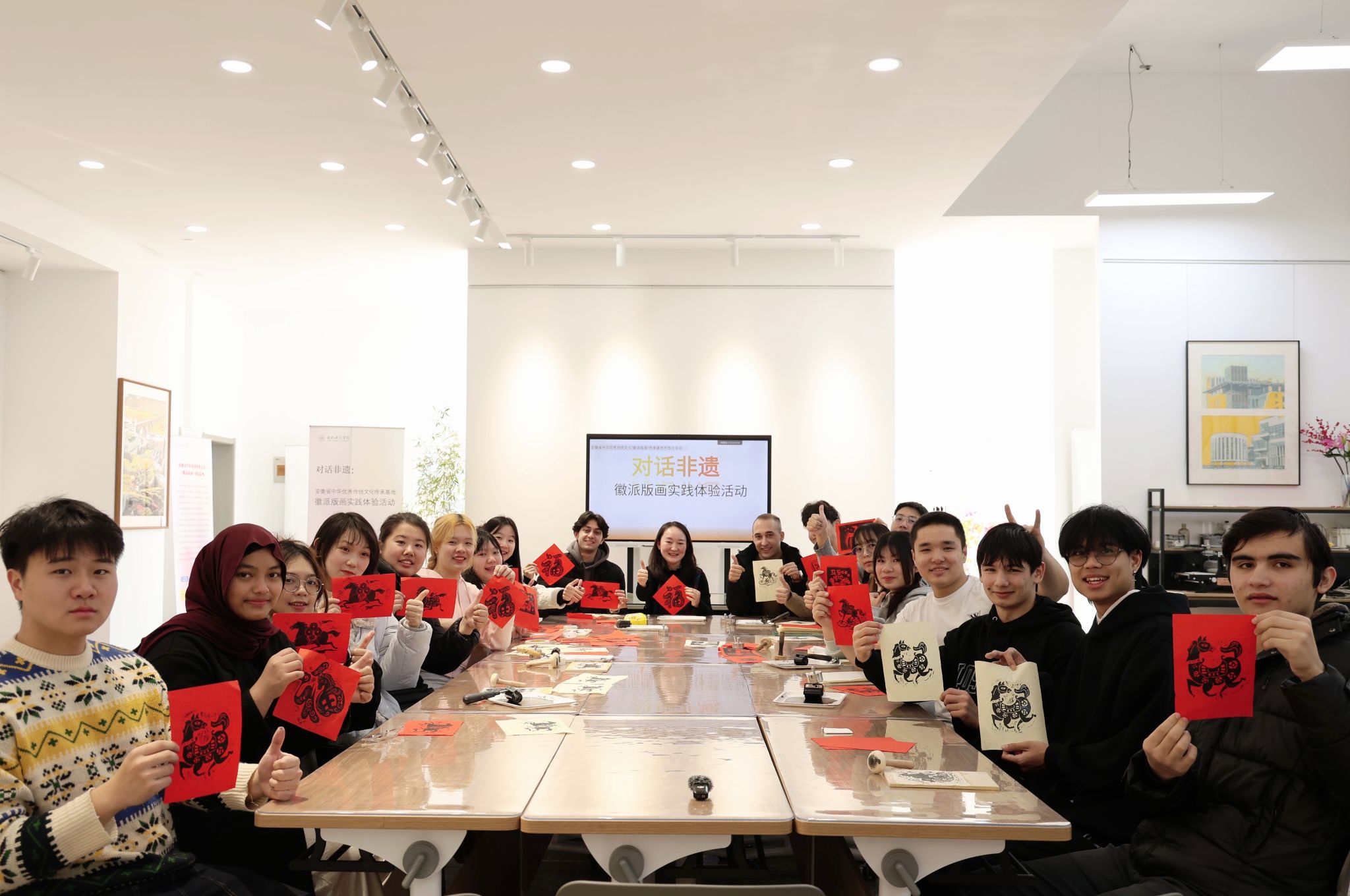 为了持续推进beat365国际生“国情教育”文化体验实践活动,1月13日,国际教育学院与美术与设计学院联合组织14名留学生走进安徽省中华优秀传统文化徽派版画传承基地,沉浸式体验徽派版画技艺。