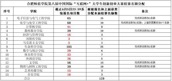 推荐晋级校赛项目数原则上为各学院申报项目总数的20%(其中申报项目总数以大赛申报系统6月5日24:00之前统计的有效作品数量为准),并综合考虑上届大赛组织情况和获奖情况等因素。各学院最终晋级校赛名额数见下表。