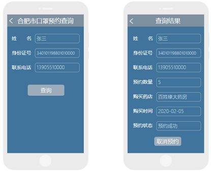 3、口罩预约查询。在“合肥医保”微信公众号点击【口罩预约】,选择【口罩预约查询】,填写姓名、身份证号、联系电话、点击【查询】后,显示预约状态的信息。如需取消预约信息,点击【取消预约】。