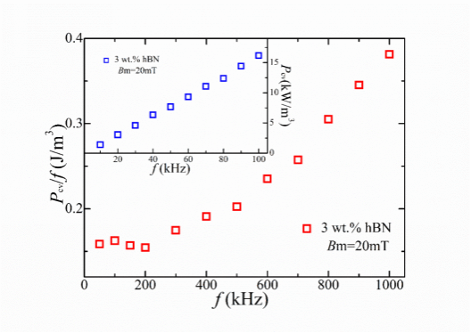 图二在20 mT时,测量FeSiAl/3 wt.% hBN复合材料的磁损耗随频率的变化关系