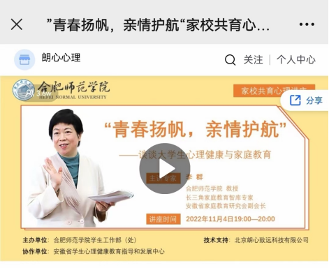 本网讯 为贯彻落实安徽省教育厅《关于深化家校共育促进学生心理健康教育工作的通知》的文件精神,深入开展家校联动,发挥家庭育人重要作用,共同提升学生心理健康素养,学校组织开展主题为“青春扬帆,亲情护航——谈谈大学生心理健康与家庭教育”家校共育线上心理讲座。本次讲座由学生工作(部)处大学生心理健康教育中心主办,由教师教育学院李群教授主讲。讲座得到省内各高校大力支持,学生和家长积极广泛参与,直播现场实时在线3.6万人。