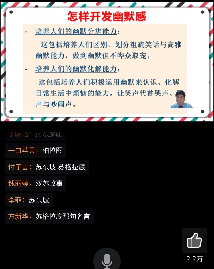 岳晓东在讲座中指出,幽默是人类的突出特征,笑是人类独有的功能,阐述了幽默在日常生活中是十分常见的,还举出苏格拉底与柏拉图、苏轼和友人的有趣经历,用生动形象的案例加深同学们的理解,指出“提升幽默的五大好处”,即提高创造思维、增强人生智慧、和谐人际关系、培养个人魅力、促进身体健康。岳教授通过自己的研究解读了幽默与积极心理品质的关系,将幽默分为自强型幽默、亲和型幽默、攻击型幽默和自贬型幽默。最后,岳教授对于“如何开发幽默感”给大家支招,即培养幽默的分辨能力和幽默的化解能力。