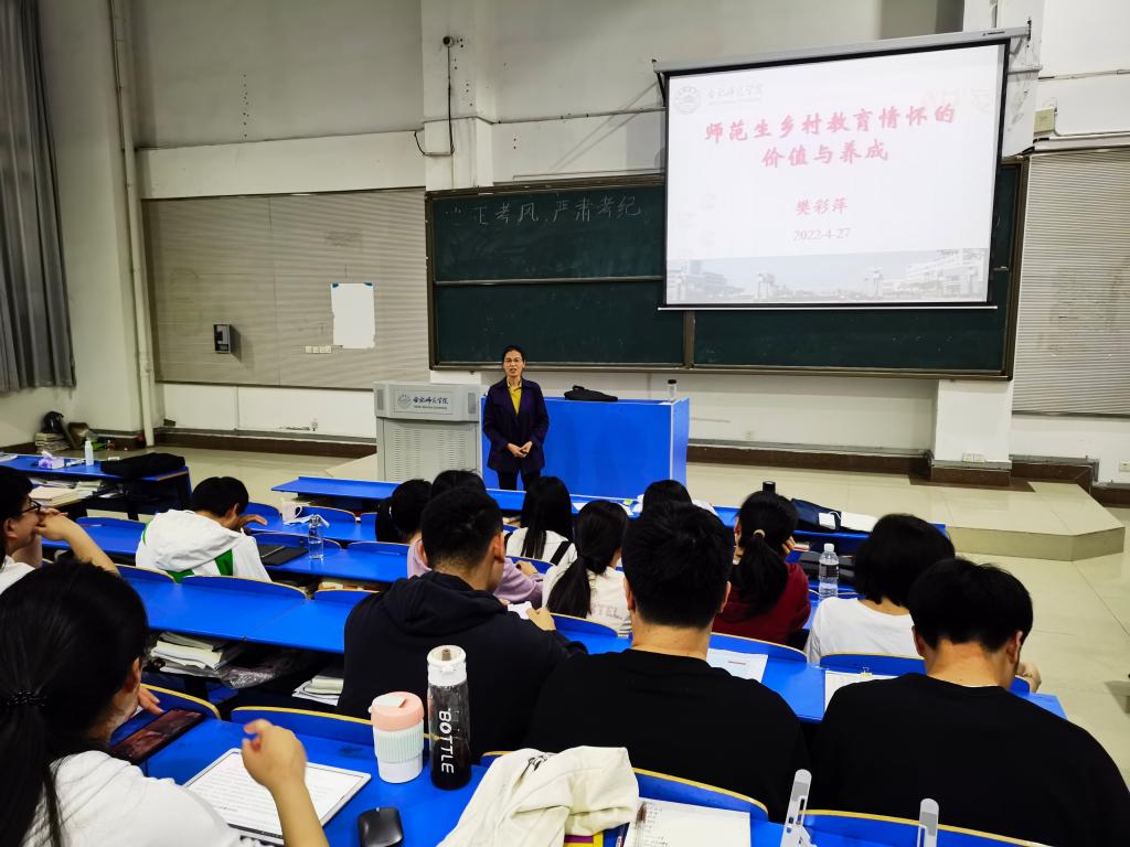 本网讯 教师教育学院小学教育专业学生是定向招收、定向培养、定向就业的未来乡村教师。为促进学生增强乡村从教意愿、坚定乡村从教信念,4月27日下午,教师教育学院在锦绣校区逸夫楼西阶一教室举办了题为“师范生乡村教育情怀的价值与养成”的学术讲座。讲座由教师教育学院研究员樊彩萍主讲,2018级、2019级小教专业学生参加学习、交流。