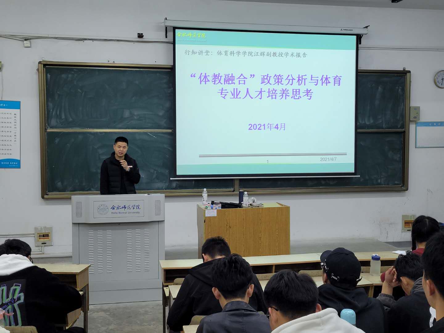 本网讯 4月7日下午,“行知学堂”学术报告在锦绣校区博约楼111教室举行。本场报告由体育科学学院汪辉副教授主讲,主题为“‘体教融合’政策分析与体育专业人才培养思考”,体育教育、运动训练、舞蹈表演和运动康复专业近200名学生聆听了报告。