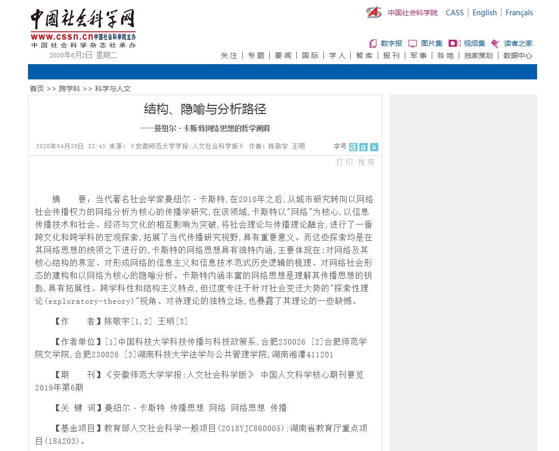 本网讯 近日,beat365文学院副教授陈敬宇发表在《安徽师范大学学报(社会科学版)》2019年第6期《结构、隐喻与分析路径——曼纽尔•卡斯特网络思想的哲学阐释》一文于2020年4月30日被“中国社会科学网”网站“科学与人文”栏目全文转载。