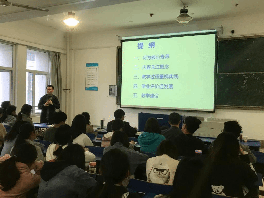 鲁亚平教授分别从何为核心素养、内容关注概念、教学过程重实践、学业评价促发展、教学建议5个方面展开论述,并举例介绍教学过程如何与实践活动相结合,同时向在座师生讲授了国外一些学者如何通过实践来证实自己的观点。