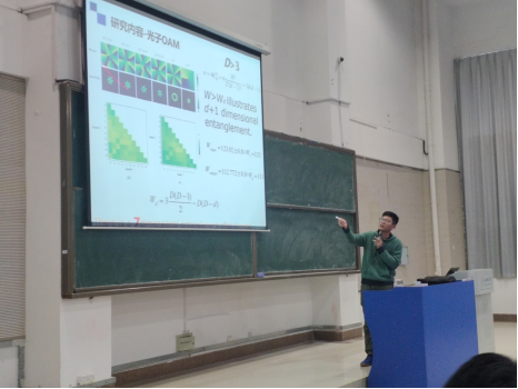 在报告中,丁冬生教授首先向大家科普性了量子世界的特点,并列举了大量案例阐述了量子世界与经典世界的区别。随后,丁冬生教授介绍了量子存储的概念,以及外置式存储和内置式存储两种存储方式,强调了利用光和冷原子系综相互作用实现单光子和存储单元之间的混合纠缠、以及存储单元之间的混合纠缠对于构建混合自由度的量子网络的重要意义。报告会上,丁冬生教授还详细介绍了如何实现光子轨道角动量、偏振、路径等单个自由度纠缠的存储,以及多个自由度的混合纠缠和超纠缠的量子存储。互动提问环节中,丁冬生教授对师生们提出的每个问题都给予了认真、详细地解答,让大家深受启发。