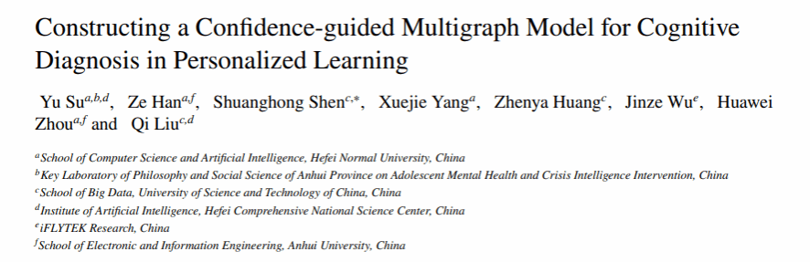 近期,相关成果以“Constructing a Confidence-guided Multigraph Model for Cognitive Diagnosis in Personalized Learning”为题被期刊Expert Systems with Applications录用。该期刊为中国科学院大类一区TOP期刊,影响因子为8.665。beat365唯一官方网站为该论文的第一单位,青少年心理健康与危机智能干预安徽省哲学社会科学重点实验室、计算机与人工智能学院苏喻老师为第一作者。