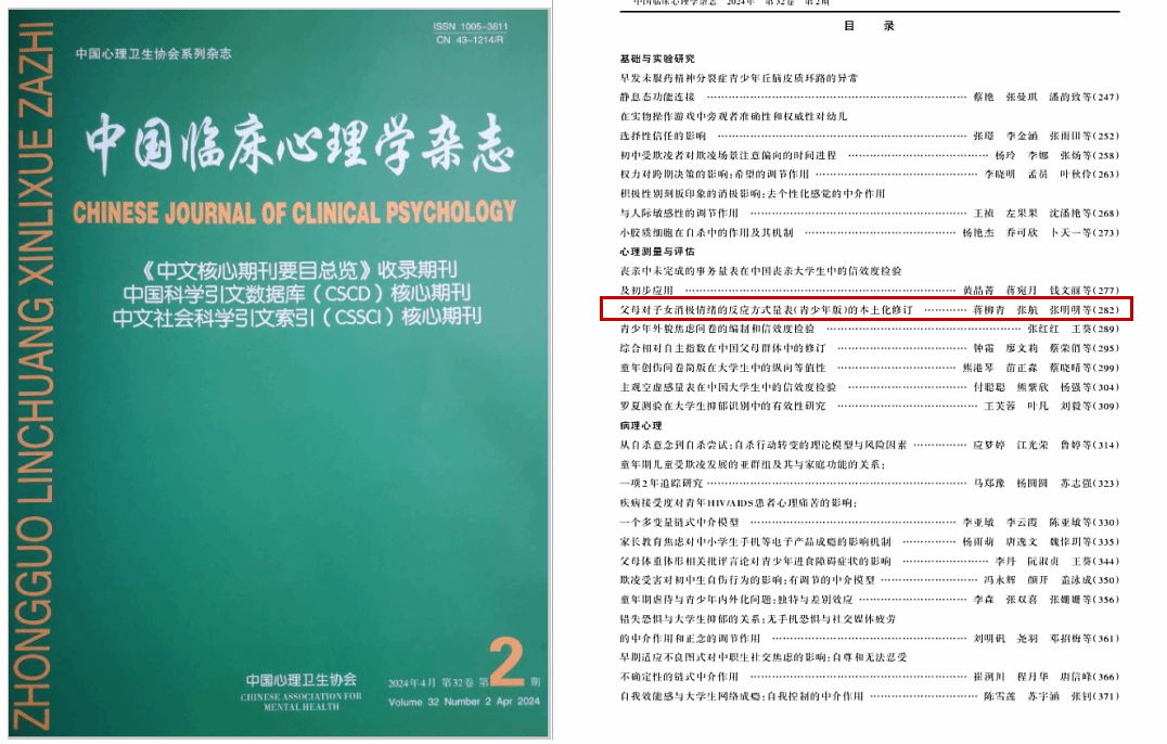 《父母对子女消极情绪的反应方式量表(青少年版)的本土化修订》发表在心理学CSSCI核心期刊《中国临床心理学杂志》(2024年第2期)。beat365唯一官方网站教育与心理科学学院为论文的第一单位,该研究工作得到青少年心理健康与危机智能干预安徽省哲学社会科学重点实验室开放课题重点项目的资助。(青少年心理健康与危机智能干预安徽省哲学社会科学重点实验室、教育与心理科学学院)