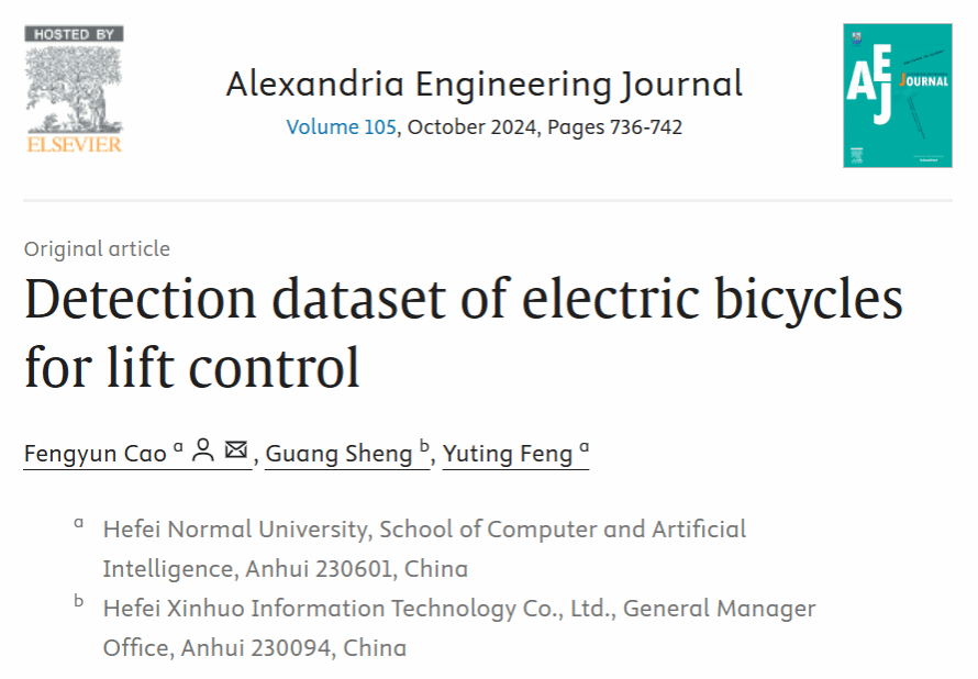 近期,相关成果以“Detection dataset of electric bicycles for lift control”为题被期刊Alexandria Engineering Journal发表(论文引用格式:Fengyun Cao, Guang Sheng, Yuting Feng, Detection dataset of electric bicycles for lift control [J], Alexandria Engineering Journal, Volume 105, 2024, Pages 736-742. )。该期刊为中国科学院二区TOP期刊,影响因子为5.9。beat365唯一官方网站为该论文的第一单位,计算机与人工智能学院曹风云老师为第一作者、通讯作者。