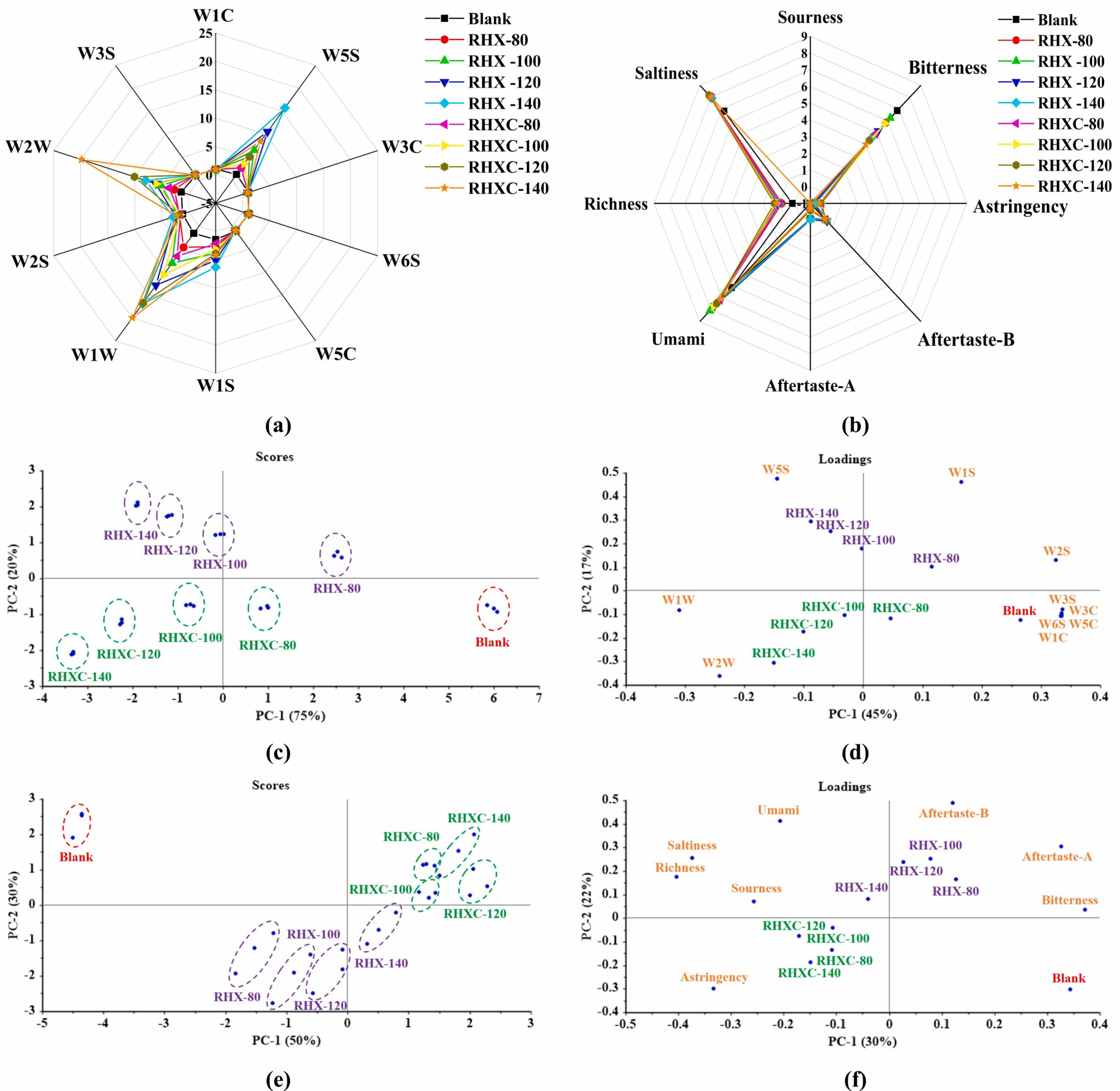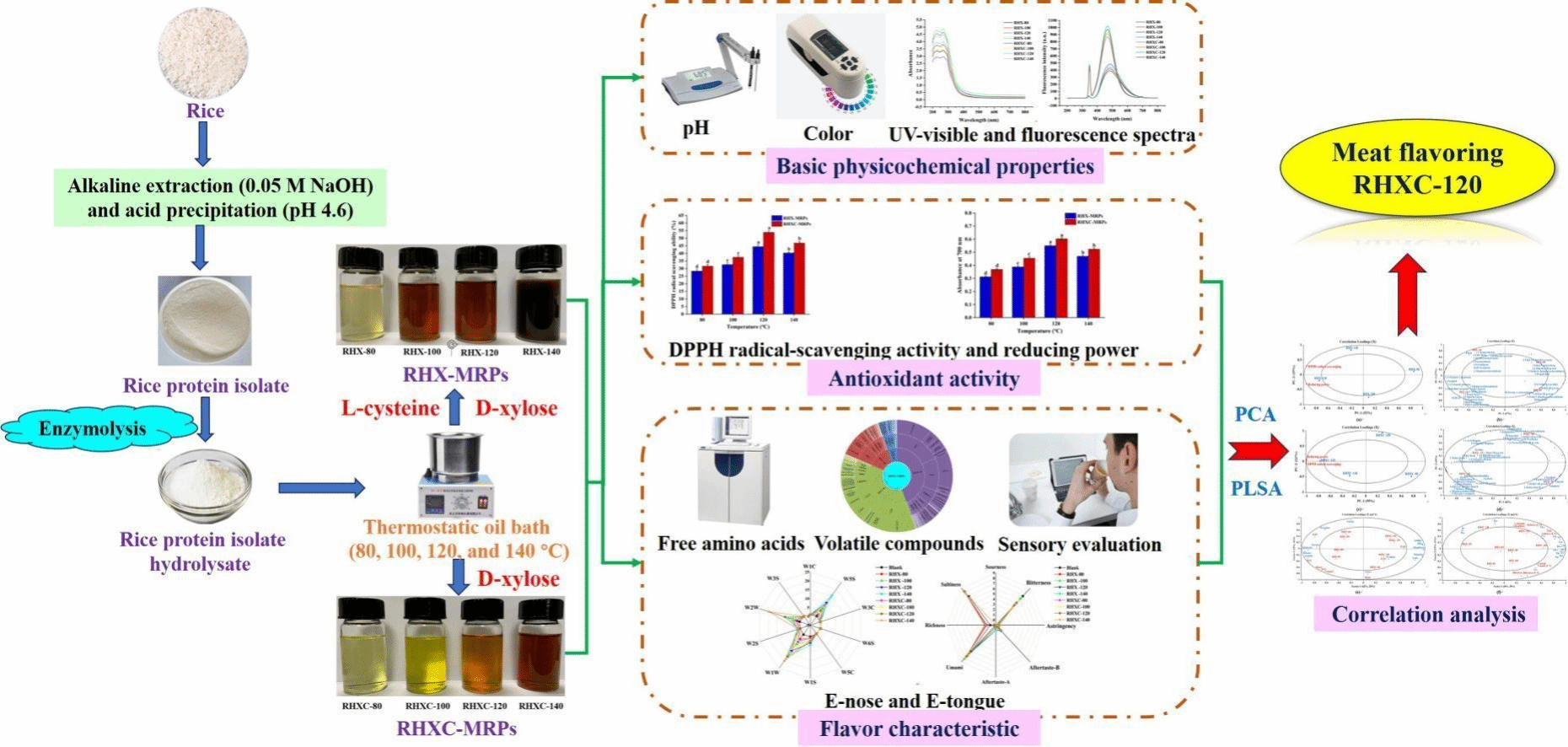 团队通过建立大米分离蛋白水解物-木糖的美拉德反应体系,通过调控温度和半胱氨酸来开发一种潜在的肉类风味剂。研究了温度和半胱氨酸添加对产物的理化性质、抗氧化活性和风味特性(游离氨基酸、挥发性化合物、气味特征、味道特征和整体感官属性)的综合影响。结果表明,温度和半胱氨酸是美拉德反应中影响肉味形成的重要加工变量。升高温度会加深产物颜色,促进挥发性化合物的形成,并降低整体鲜味和苦味。半胱氨酸添加有助于抑制产物褐变、增强抗氧化性、改善口感、减少苦味以及形成肉味化合物(含硫呋喃、噻吩、噻唑、硫醇和硫化物)。在120℃下添加半胱氨酸制备的产物具有突出的抗氧化活性和相对较高的口感、鲜味、肉香和相对较低的苦味,未来有望开发作为潜在肉类风味剂。