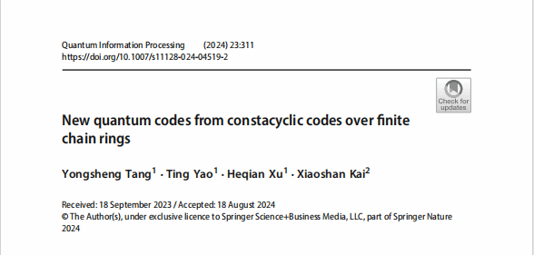 近期,数学与统计学院“基础数学”省级重点学科代数编码团队唐永生、许和乾、姚婷在量子纠错码构造方向取得进展,相关成果New quantum codes from constacyclic codes over finite chain rings在JCR二区期刊《Quantum Information Processing》公开发表。