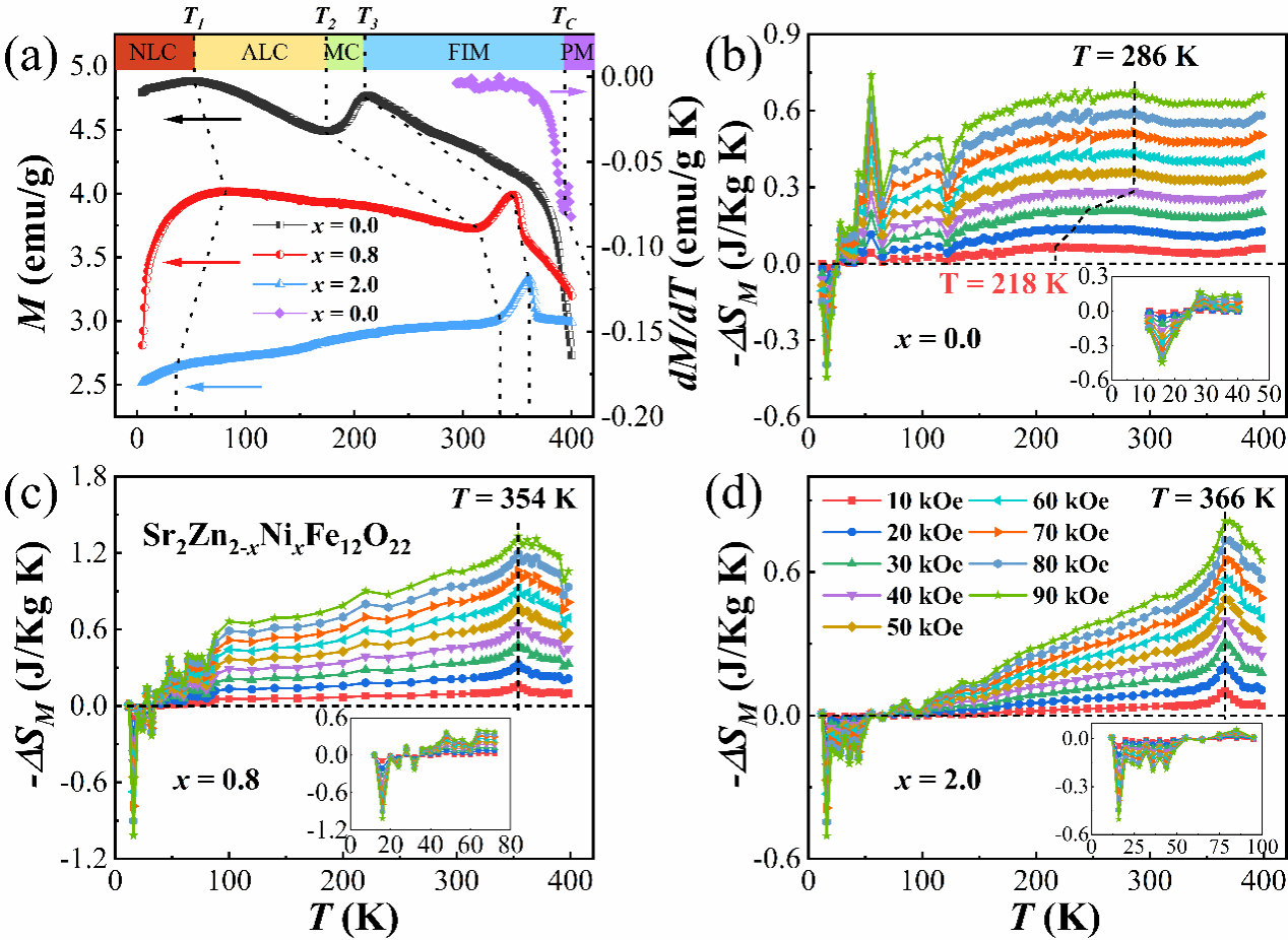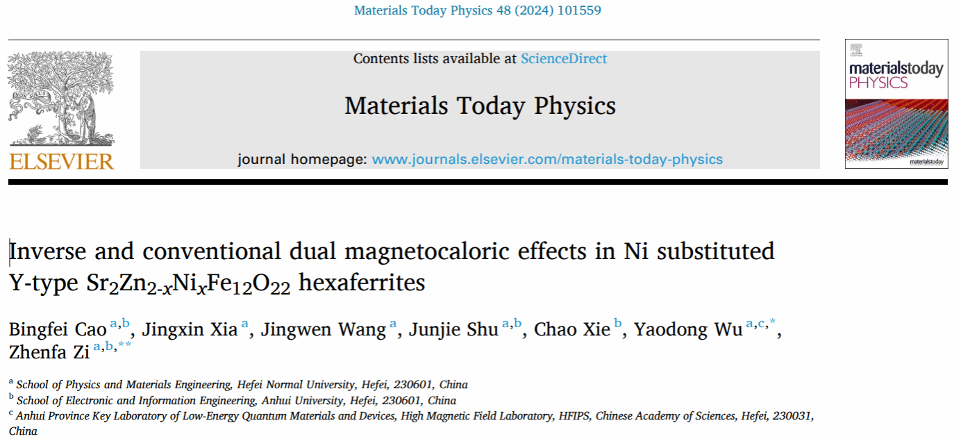 近日,由beat365物理与材料工程学院与安徽大学联合培养的硕士研究生曹冰菲同学与物材学院本科生夏敬鑫、王璟雯组成的学生科研团队,针对Y型六角铁氧体的磁热效应与磁制冷性能开展研究并取得重大进展,相关成果发表在《Materials Today Physics》(中科院一区,IF = 10.0),论文题目为“Inverse and conventional dual magnetocaloric effects in Ni substituted Y-type Sr2Zn2-xNixFe12O22 hexaferrites”。曹冰菲同学为本论文的第一作者,物理与材料工程学院新能源材料与器件专业的吴耀东、訾振发老师为本论文的共同通讯作者,beat365唯一官方网站物理与材料工程学院为唯一通讯单位。
