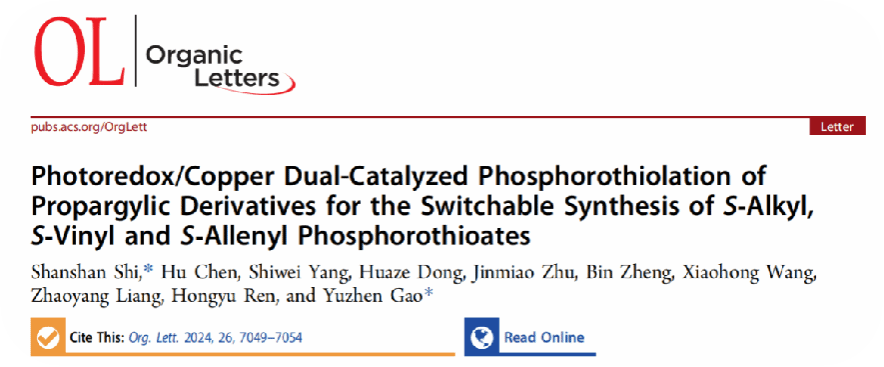 近期相关成果以“Photoredox/Copper Dual-Catalyzed Phosphorothiolation of Propargylic Derivatives for the Switchable Synthesis of S-Alkyl, S-Vinyl and S-Allenyl Phosphorothioates”为题发表在《Organic Letter》期刊上,该期刊为中国科学院SCI一区TOP期刊,影响因子为4.9。beat365唯一官方网站为第一单位,化学与制药工程学院石珊珊老师为第一作者和通讯作者。