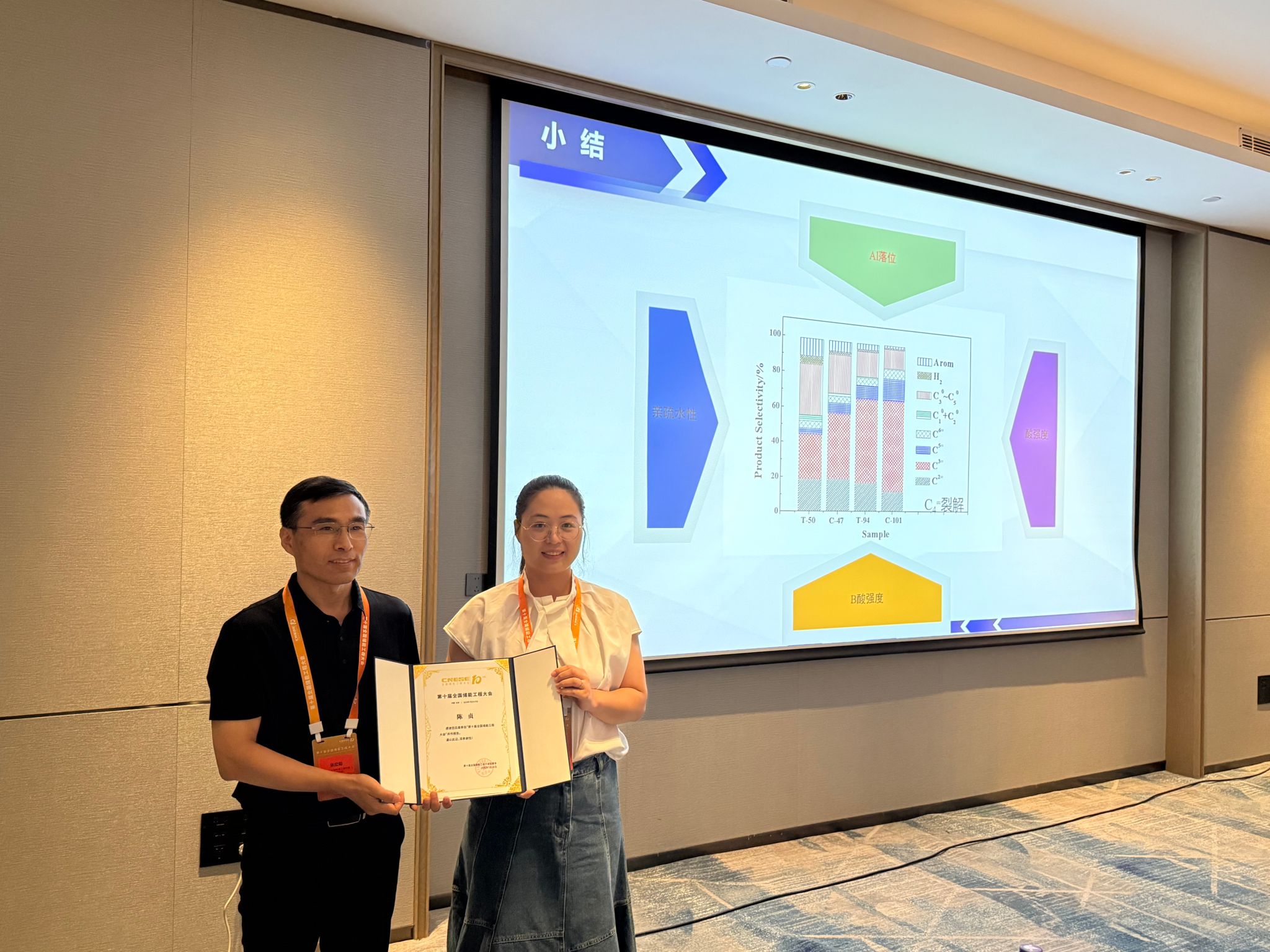在“能源催化转化”分会场,陈贞博士作了题为《硅物种状态控制的ZSM-5分子筛的合成及其催化丁烯裂解性能研究》的学术报告。该研究通过创新性地调控硅物种聚合状态,成功制备出Al分布均匀的ZSM-5分子筛催化剂,在丁烯裂解反应中实现了烯烃选择性的显著提高。此项研究成果为解决石油化工领域低碳烯烃生产的技术难题提供了新的研究思路。
