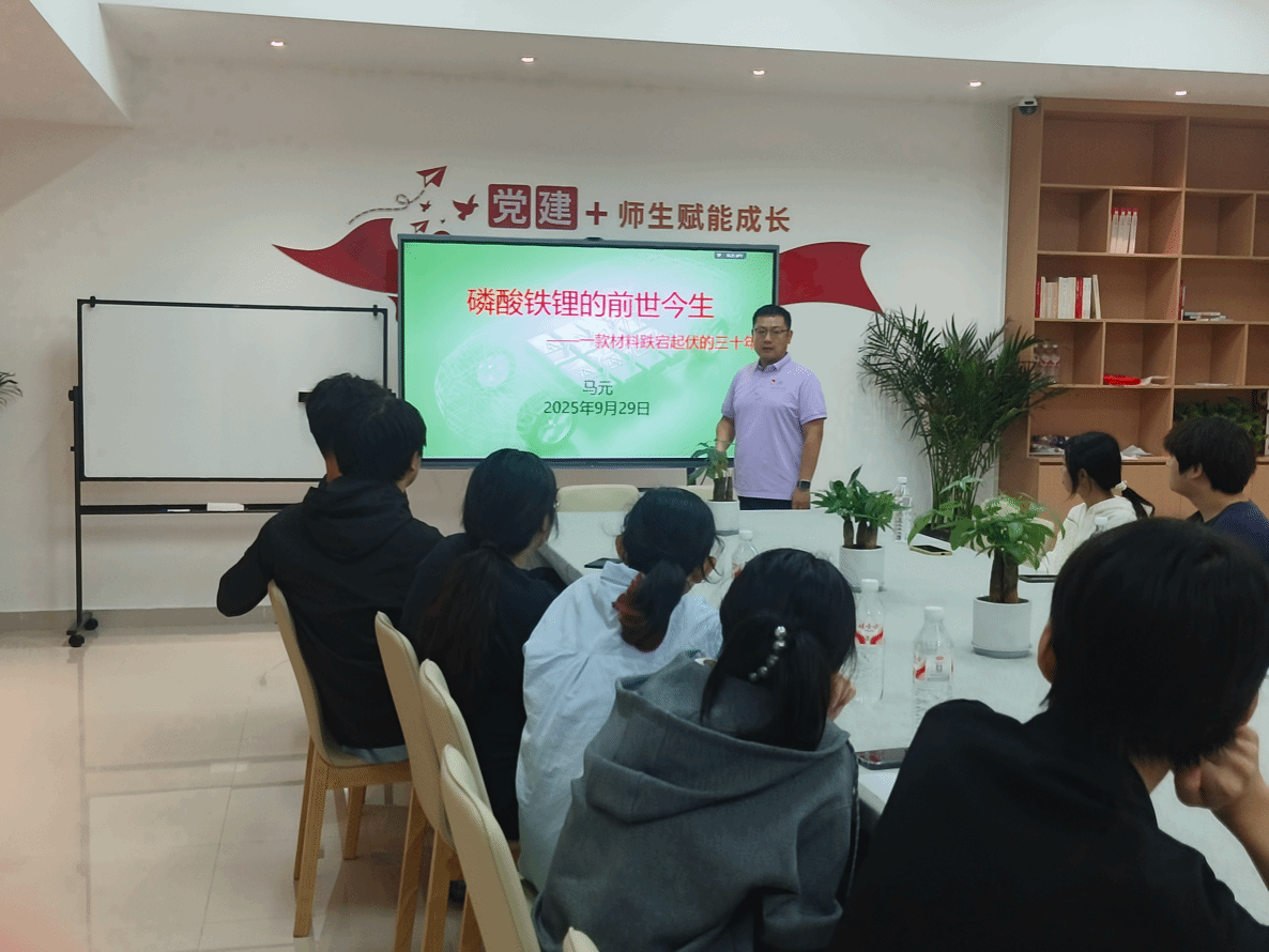 随后,党员马元老师聚焦 “磷酸铁锂的时代发展潜力”,紧扣 “国家双碳战略与新能源安全需求”,结合产业对电池材料 “高安全性、高经济性、长寿命” 的核心诉求,解读磷酸铁锂成为行业主流的优势,并主动和学生交流 “对磷酸铁锂未来研究方向的看法”以及“如何通过技术创新服务国家新能源战略”,现场氛围浓厚。